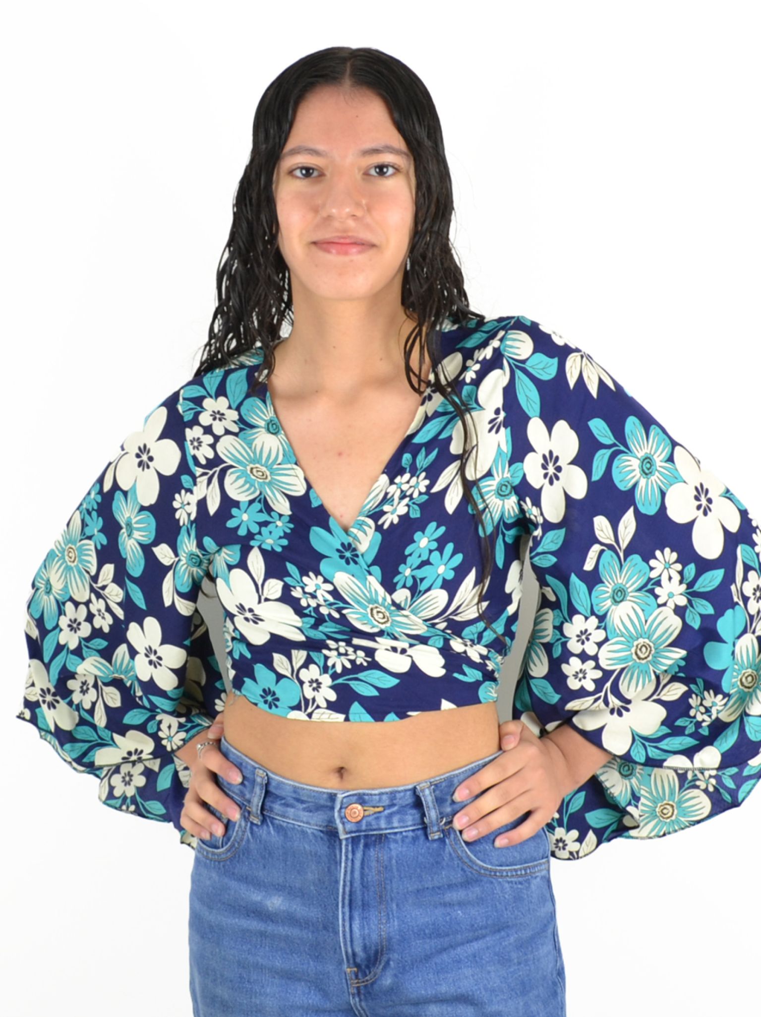 Les manches longues évasées ajoutent une touche romantique et fluide, tandis que sa longueur courte le rend facile à associer.