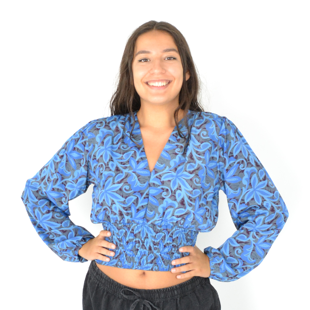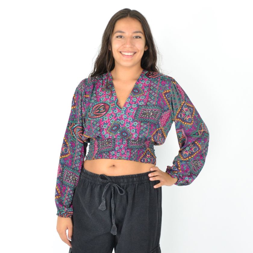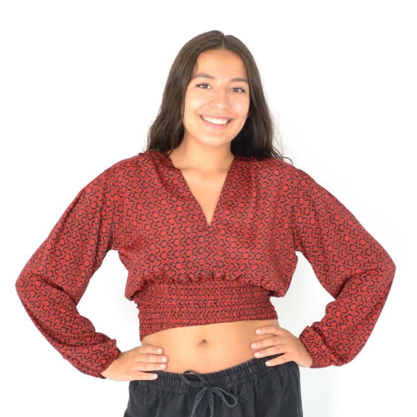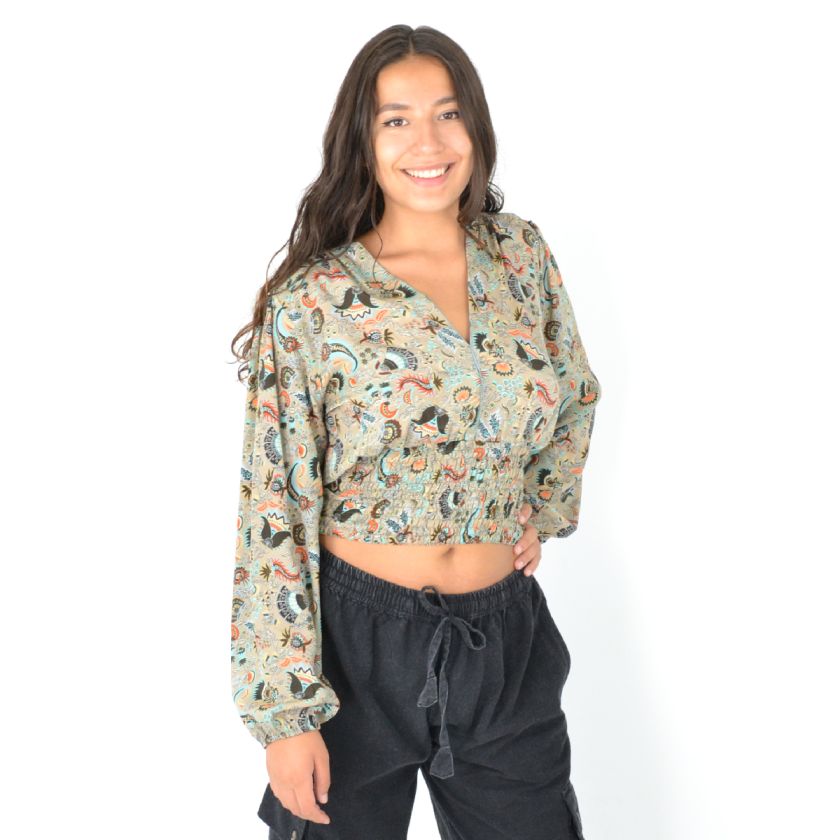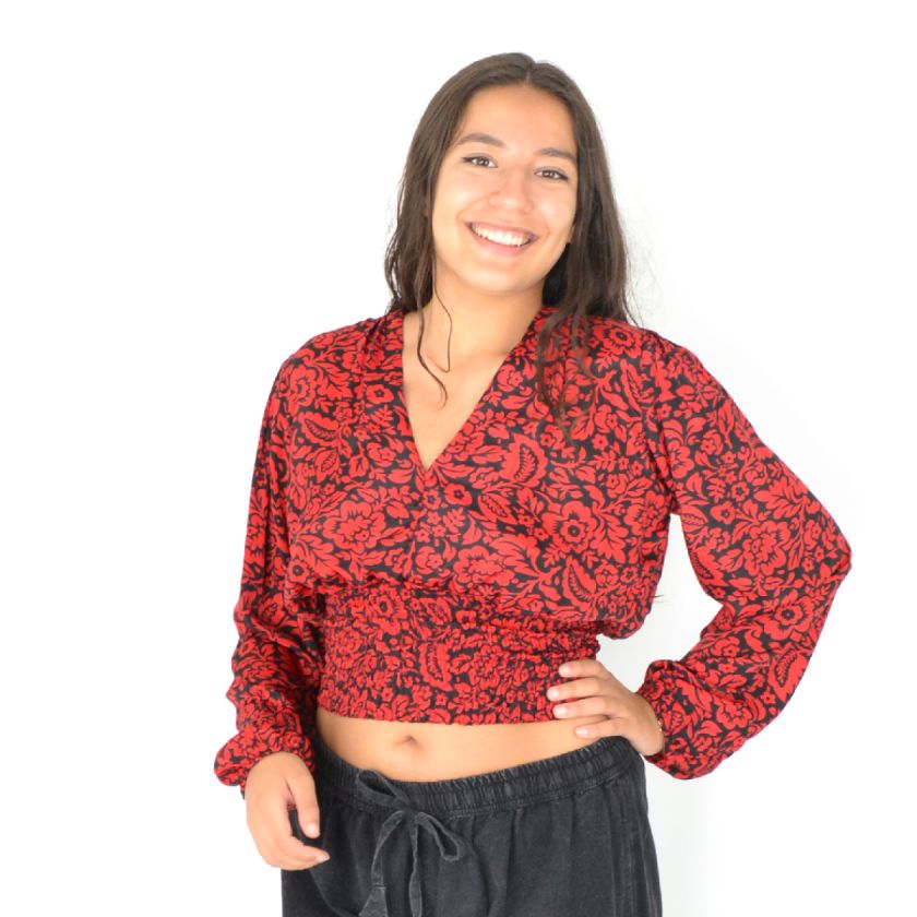 Son col en V et son imprimé moderne en font une pièce passe-partout, tandis que les élastiques aux poignets et à la taille garantissent un ajustement parfait toute la journée.