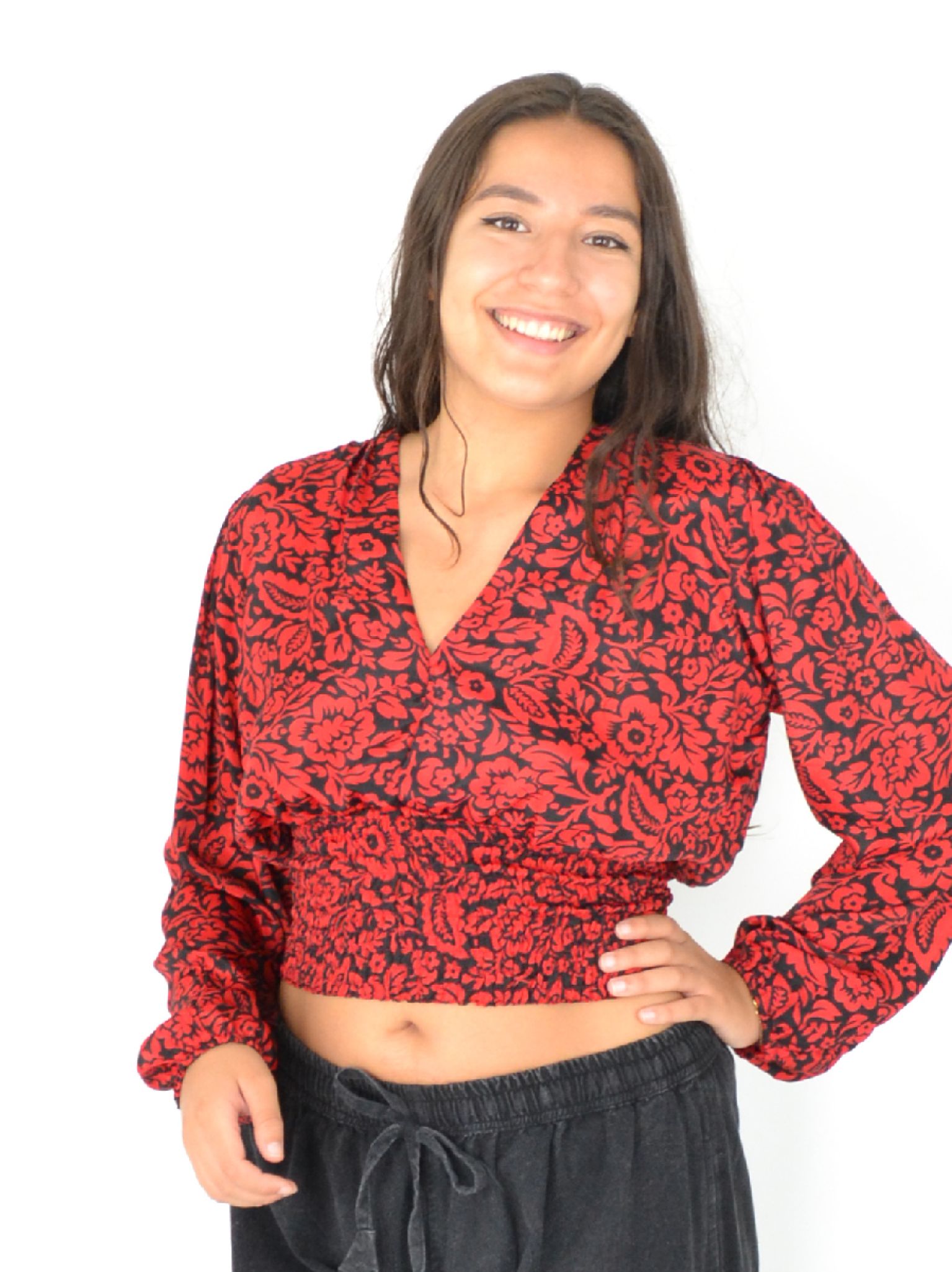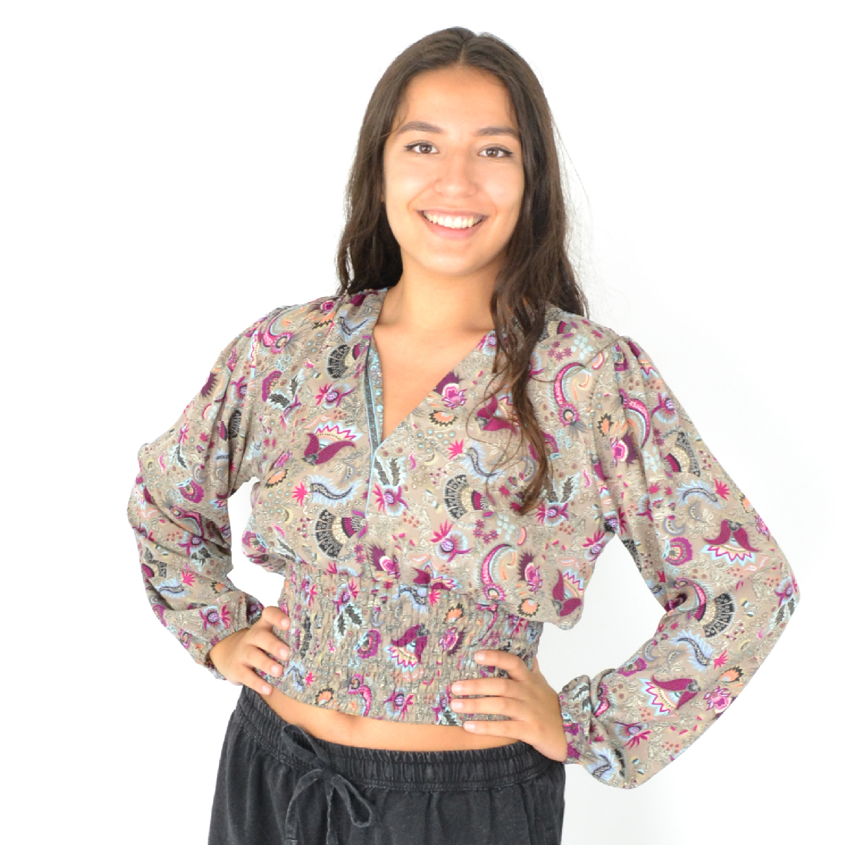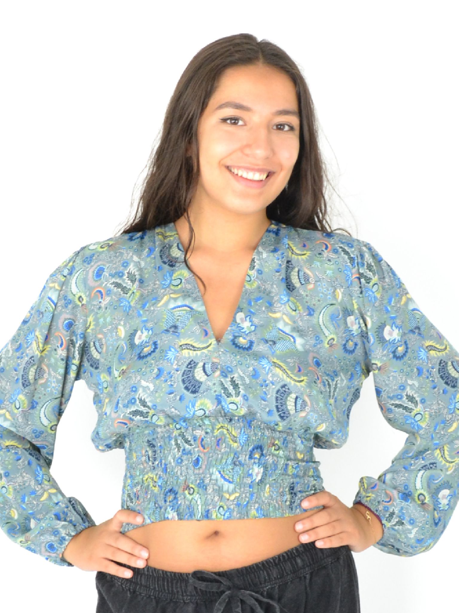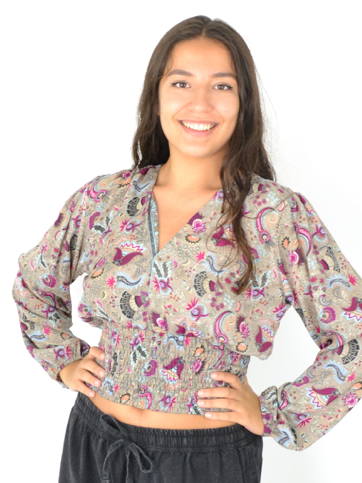 Son col en V et son imprimé moderne en font une pièce passe-partout, tandis que les élastiques aux poignets et à la taille garantissent un ajustement parfait toute la journée.