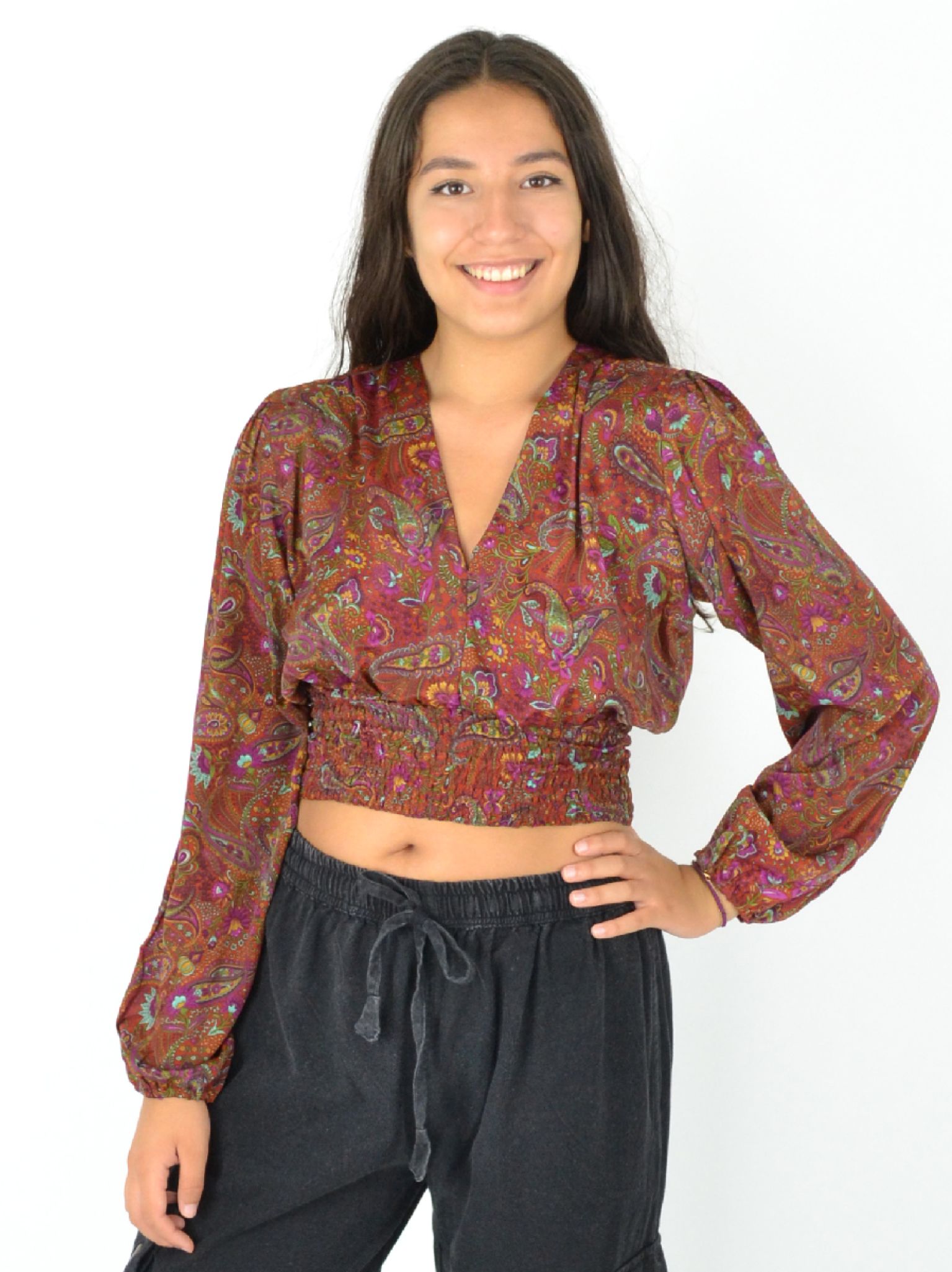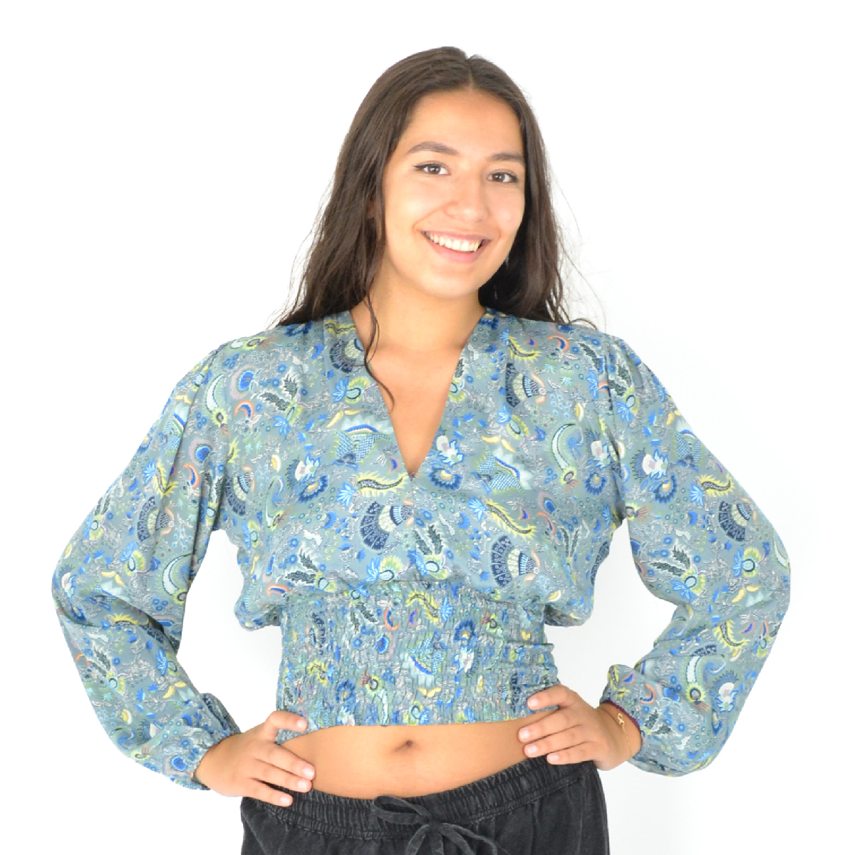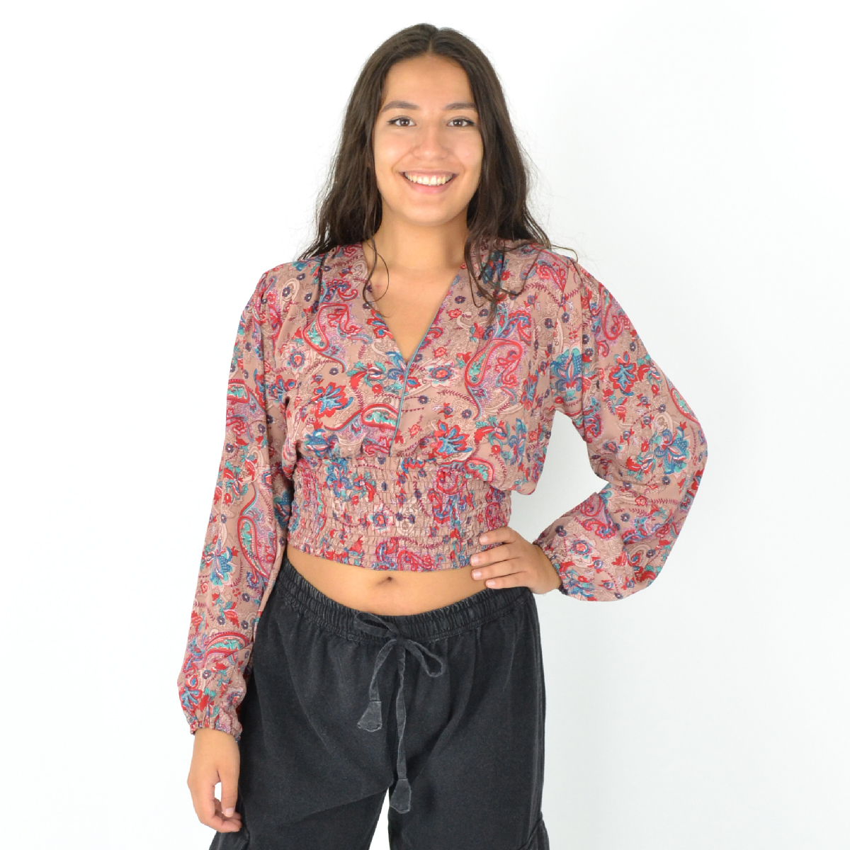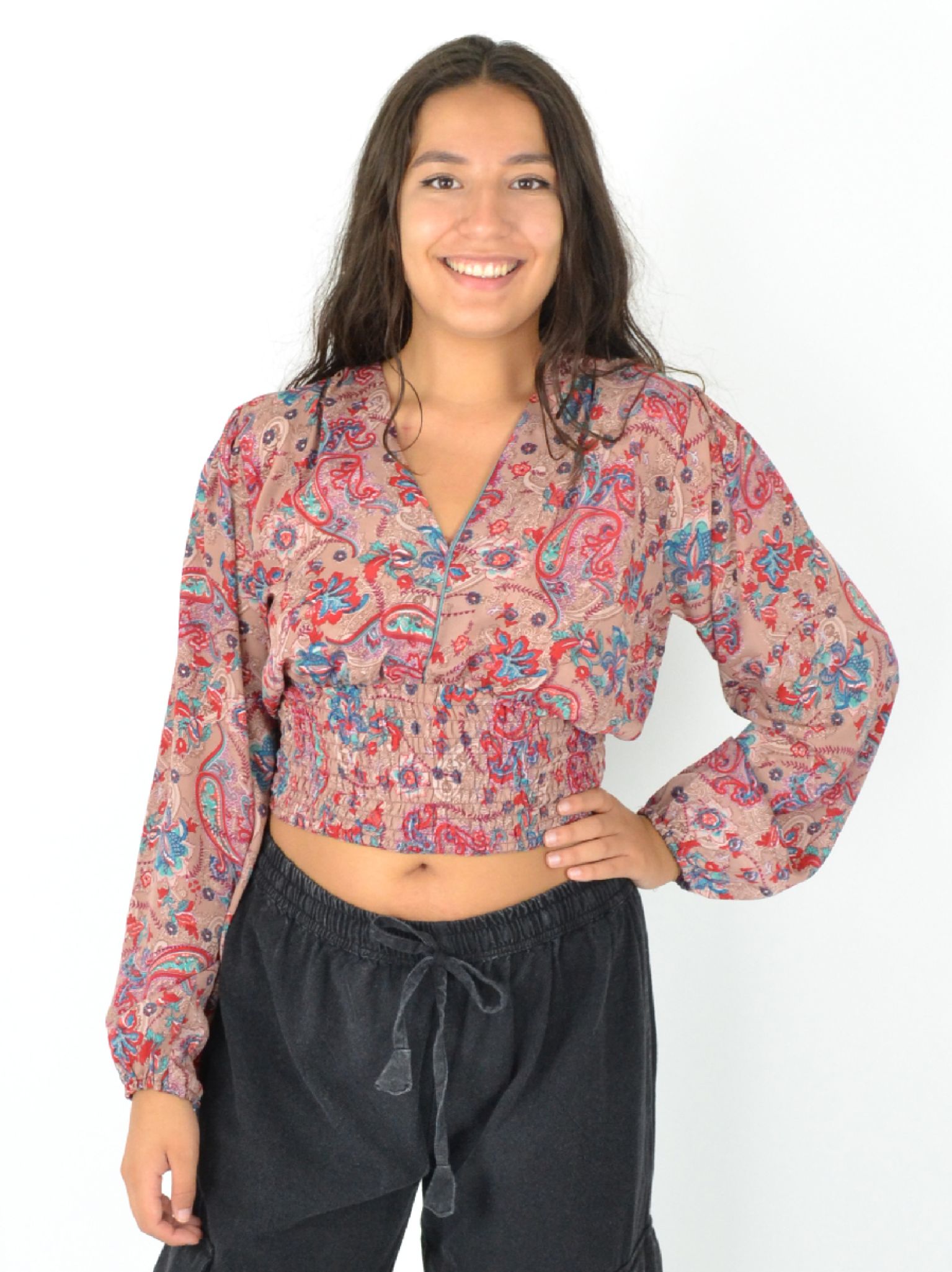 Son col en V et son imprimé moderne en font une pièce passe-partout, tandis que les élastiques aux poignets et à la taille garantissent un ajustement parfait toute la journée.