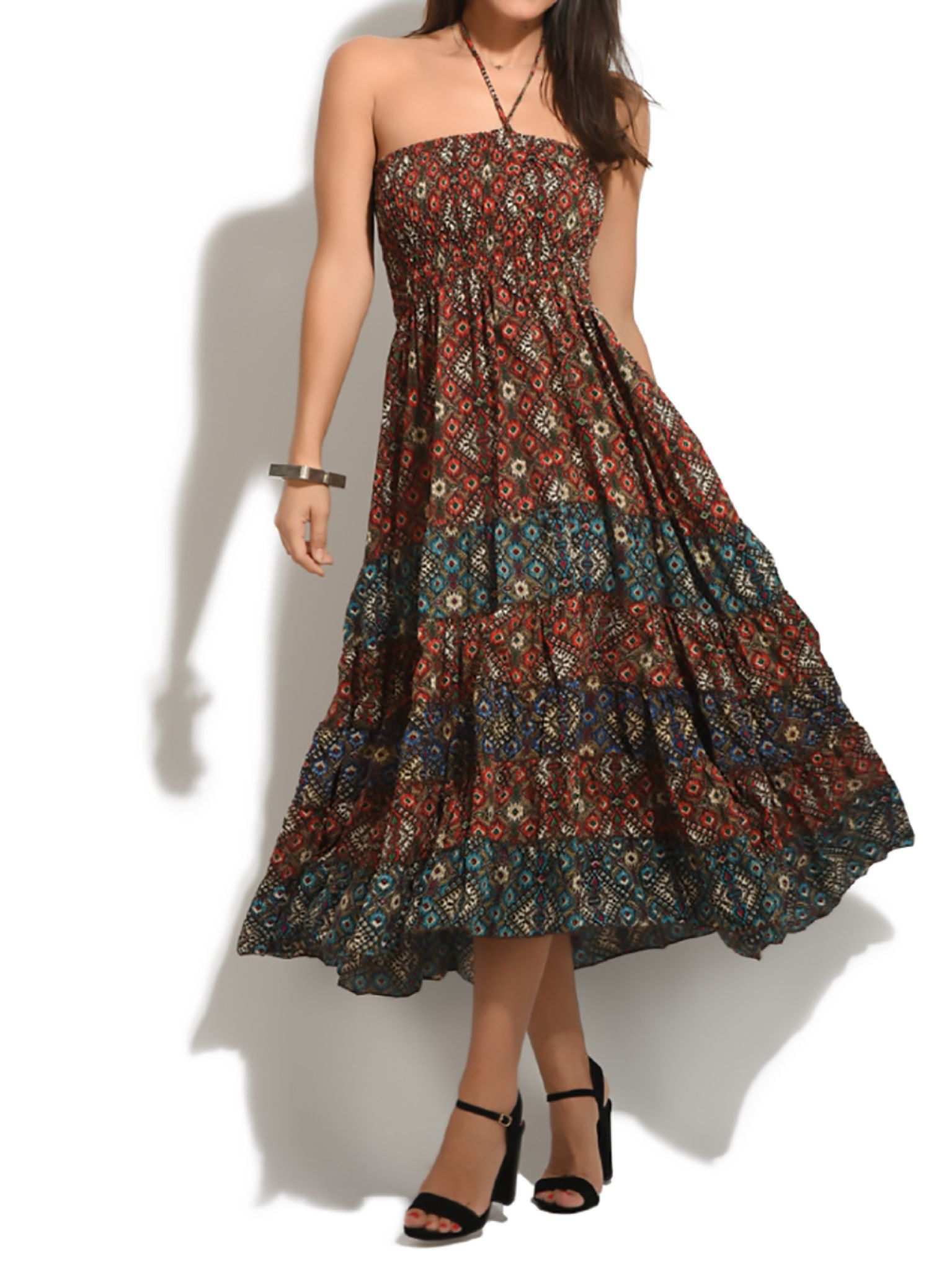 Robe mi-longue smoke col lacé 100% Polyester.
