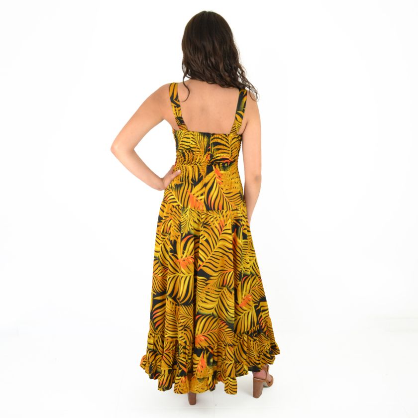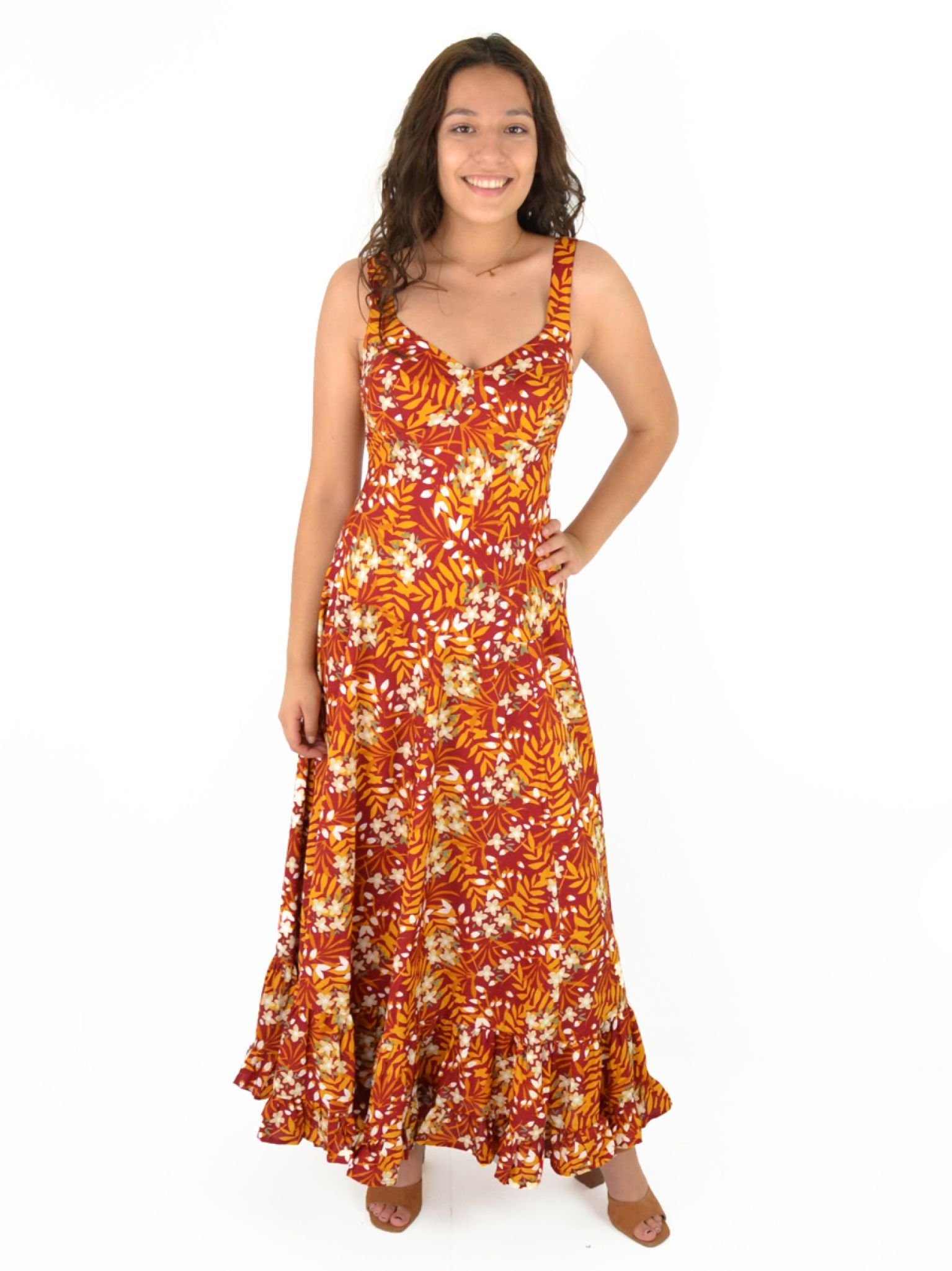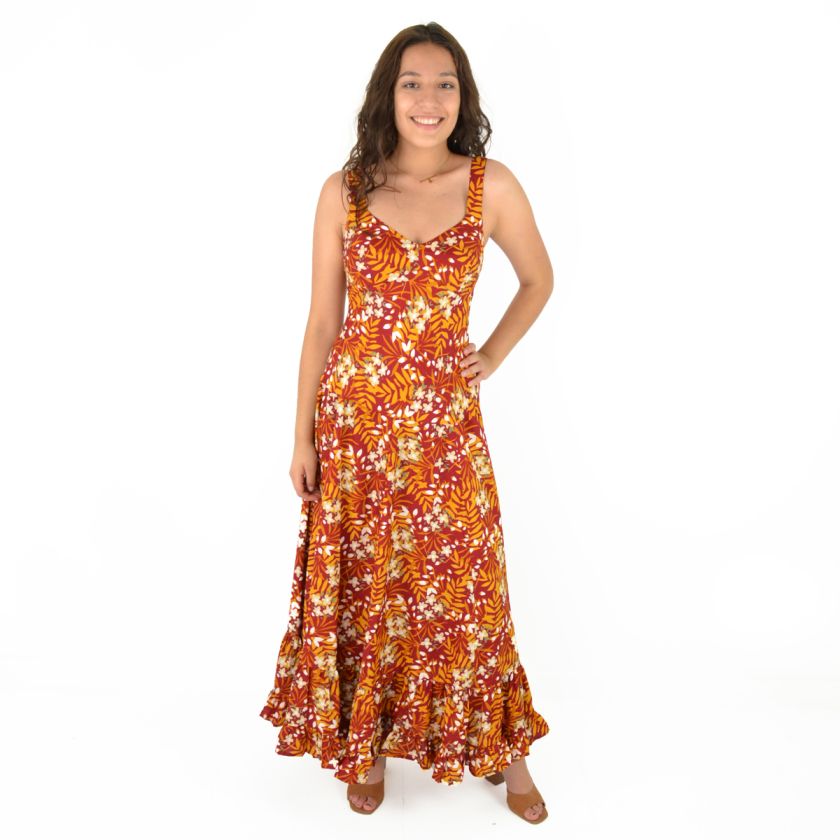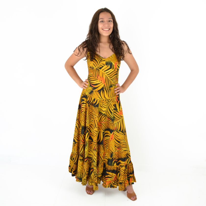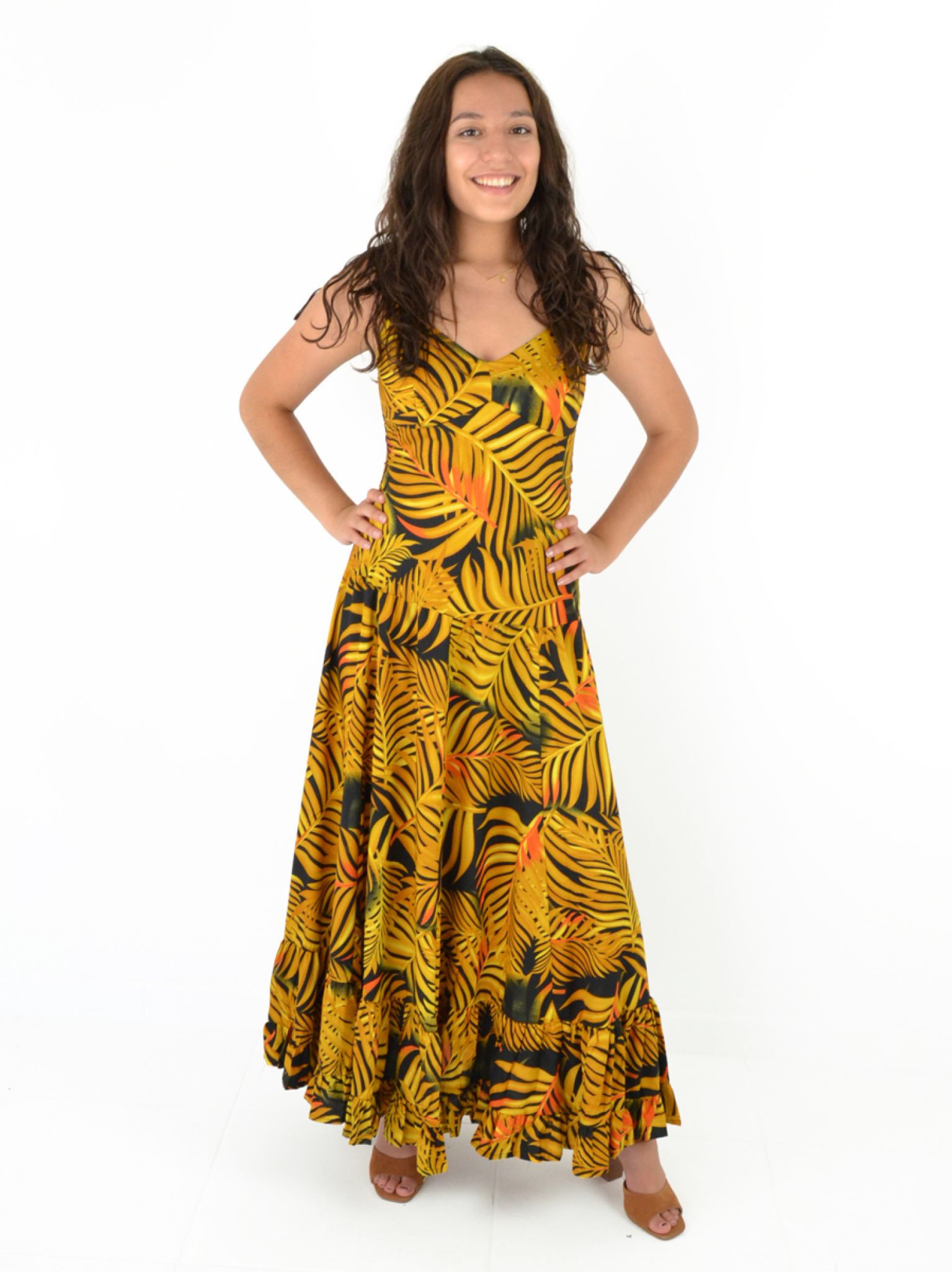 Robe longue 100 % polyester , cintrée à la taille grâce à son dos smocké. Le bas de cette robe se termine par un volant. Cette robe se décline en 19 coloris et 2 tailles différentes, S/M et L/XL.