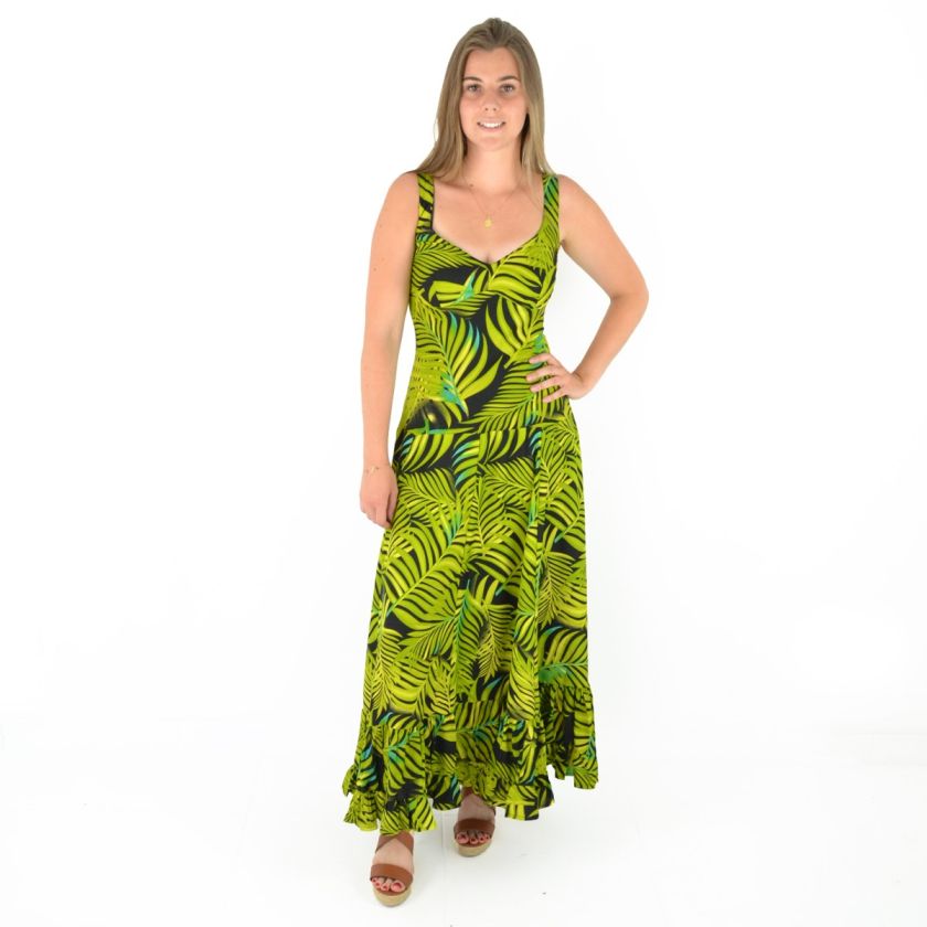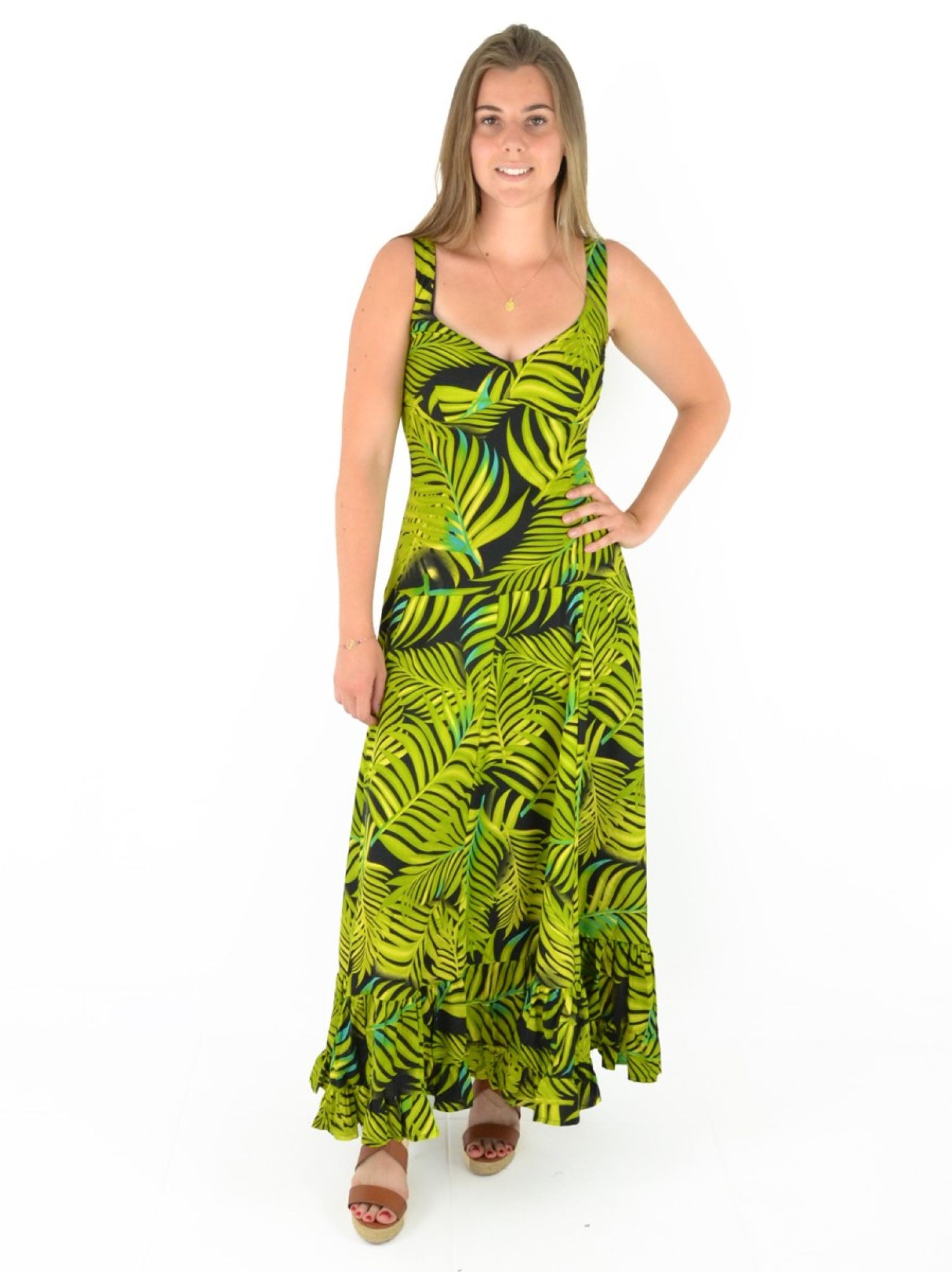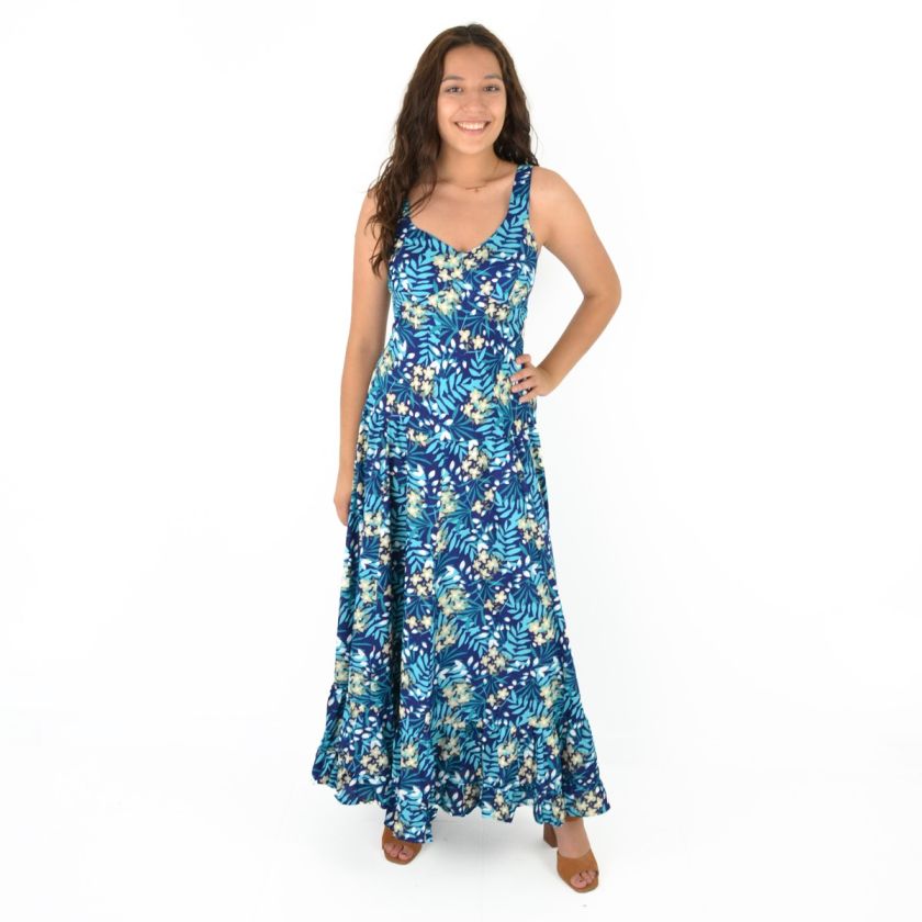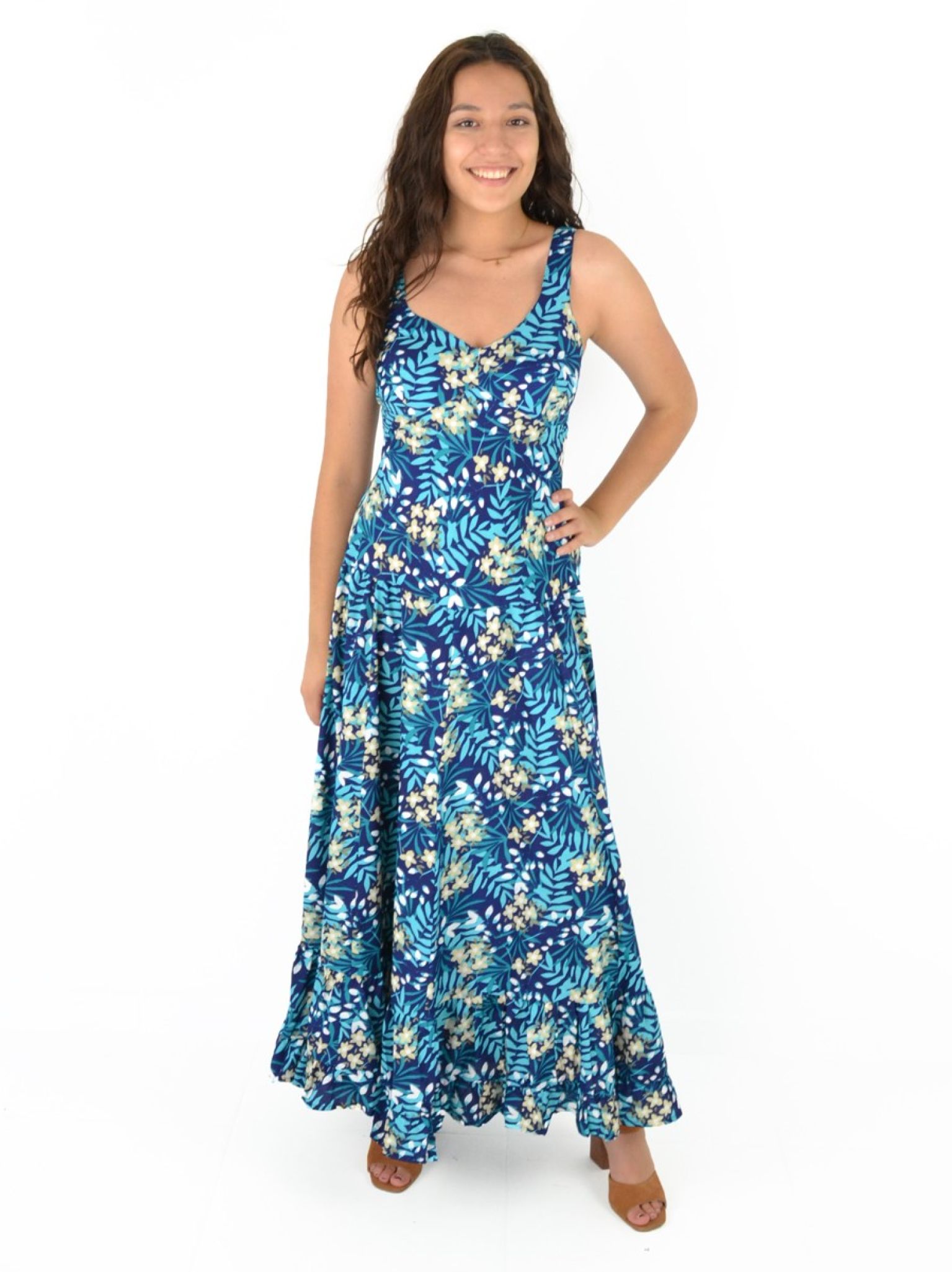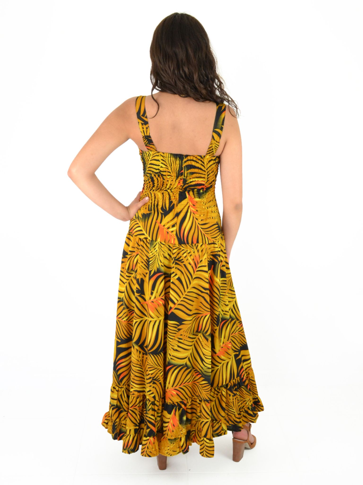Robe longue 100 % polyester , cintrée à la taille grâce à son dos smocké. Le bas de cette robe se termine par un volant. Cette robe se décline en 19 coloris et 2 tailles différentes, S/M et L/XL.
