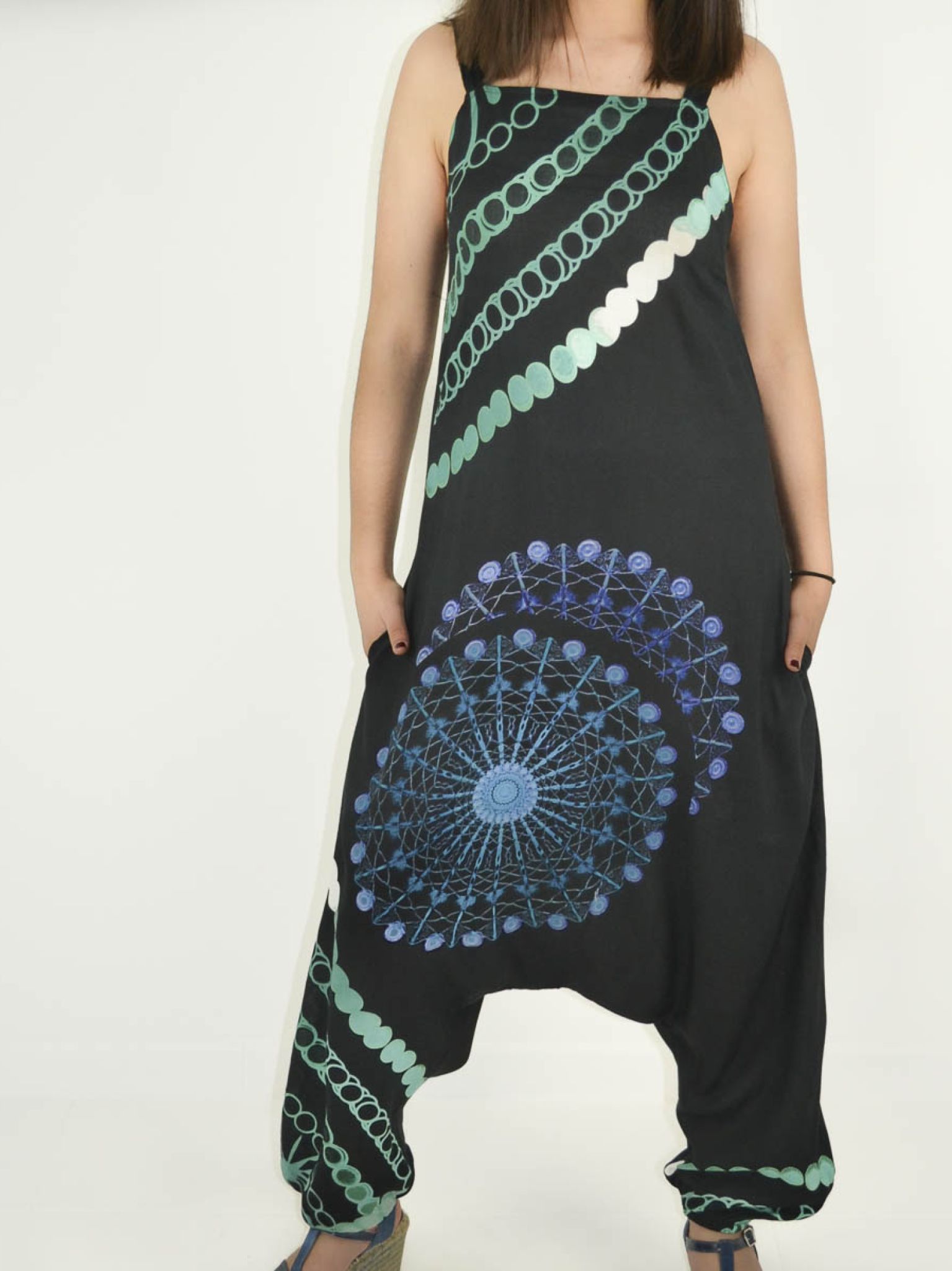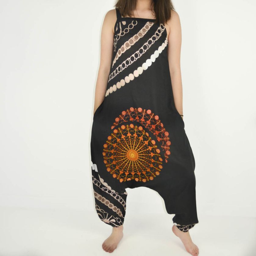 Cette salopette sarouel en 100% rayonne offre un style unique alliant fluidité et confort absolu.