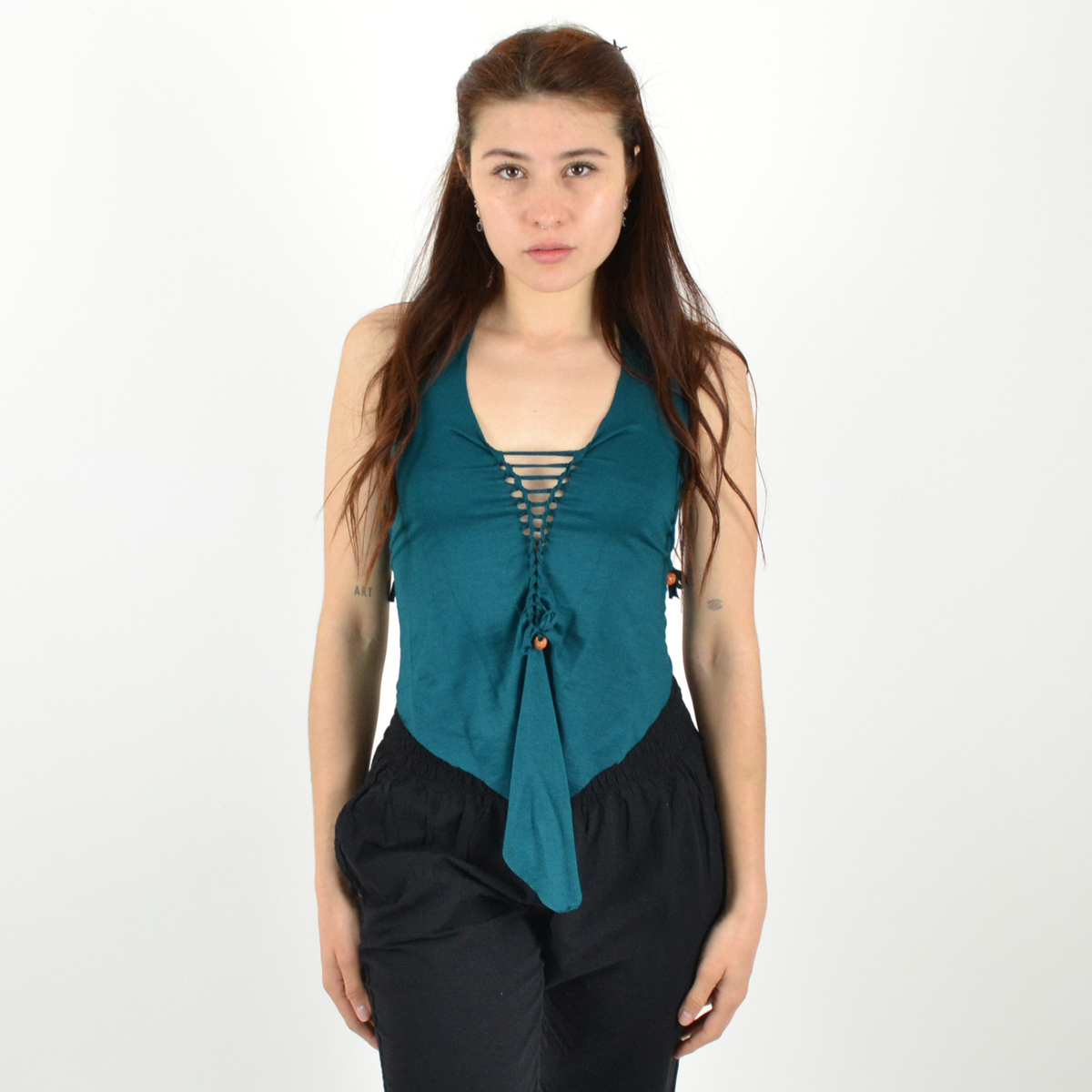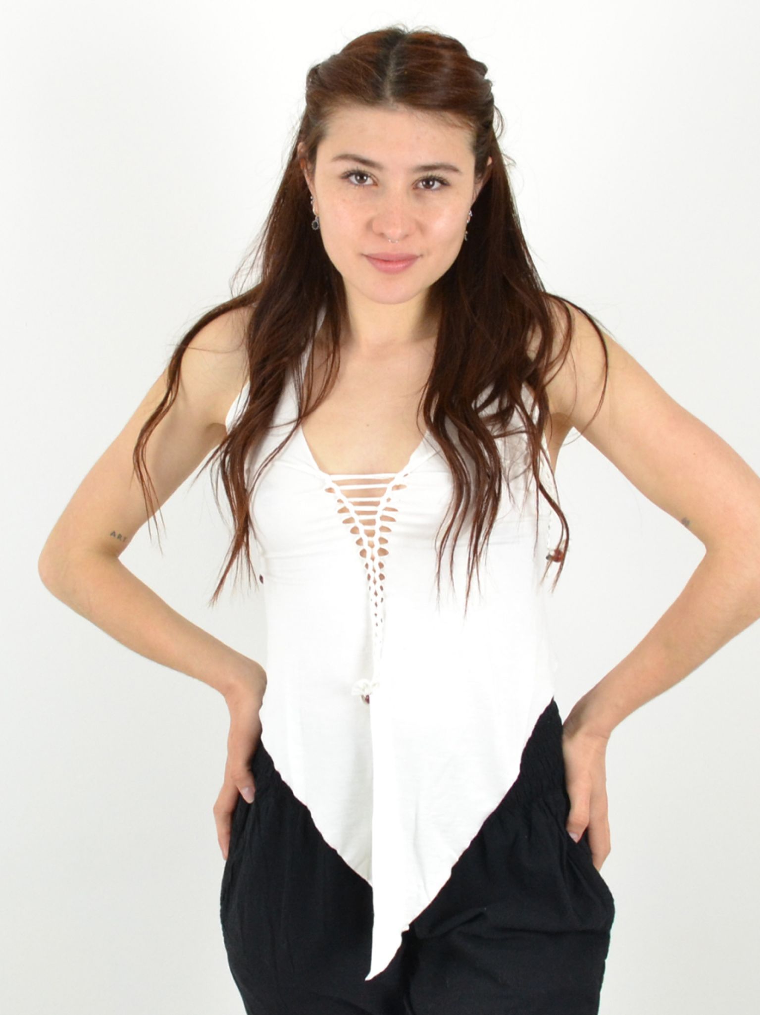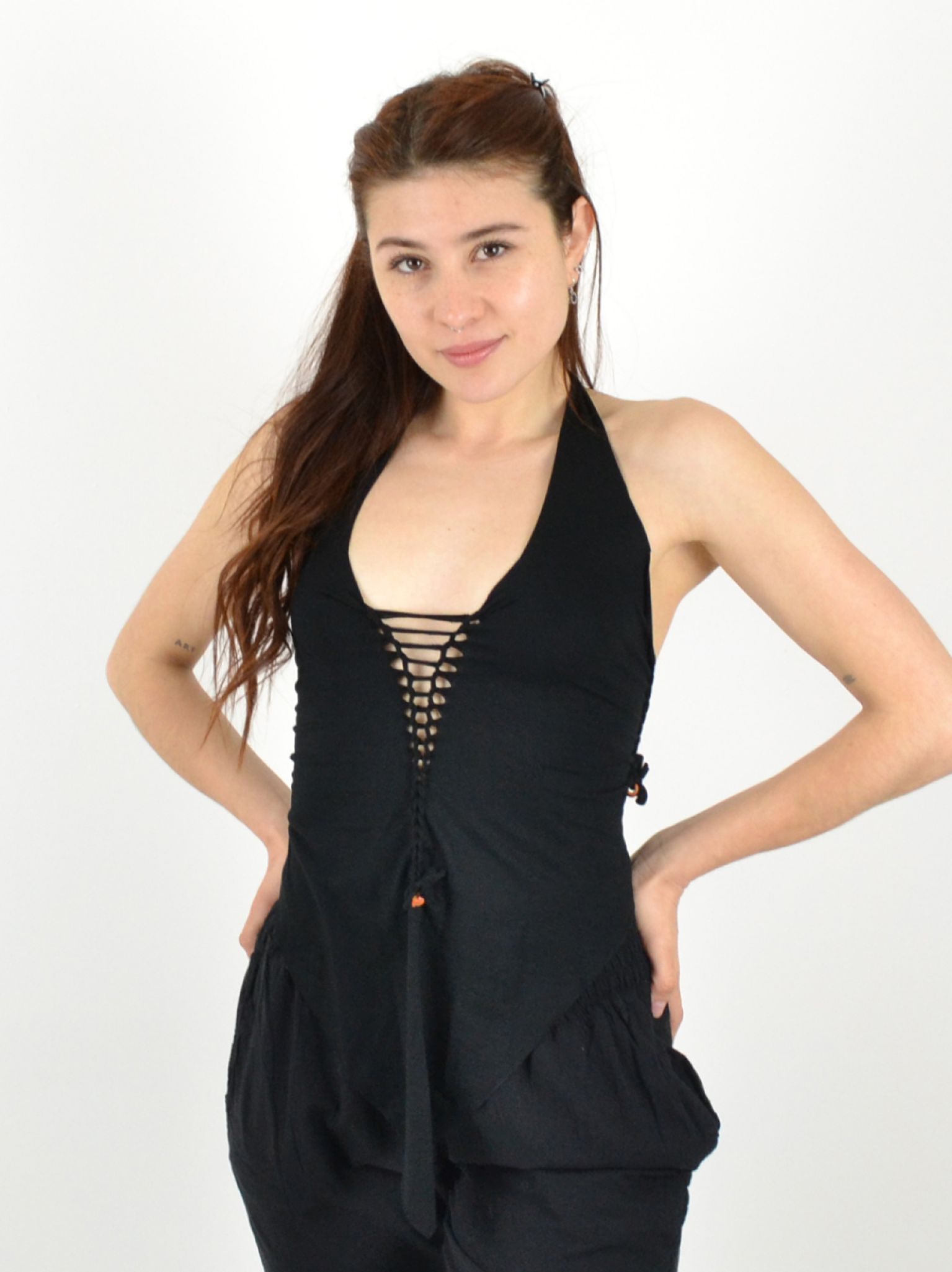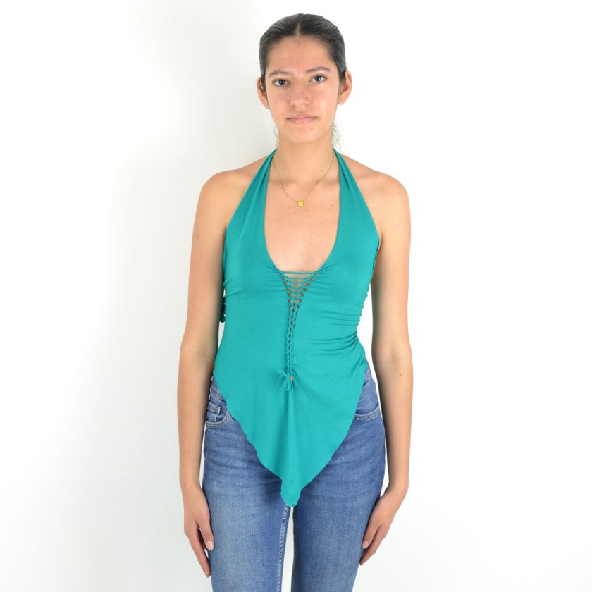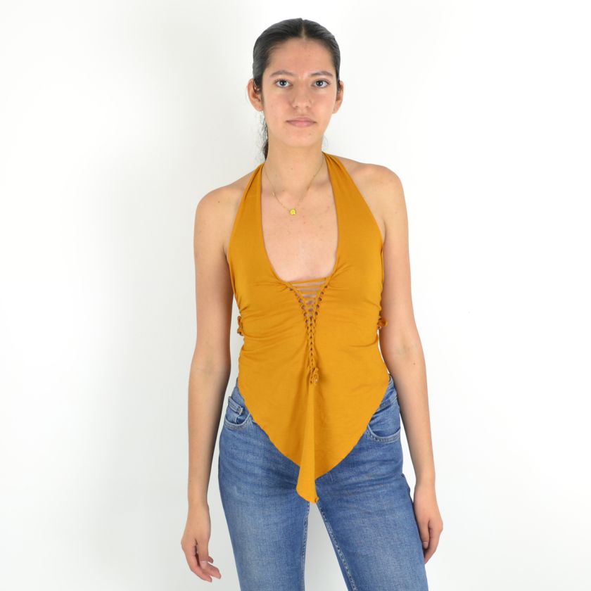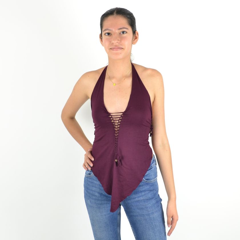 Long devant, court derrière, avec un dos corseté et un laçage ajustable sur le devant, ce top allie féminité et caractère.