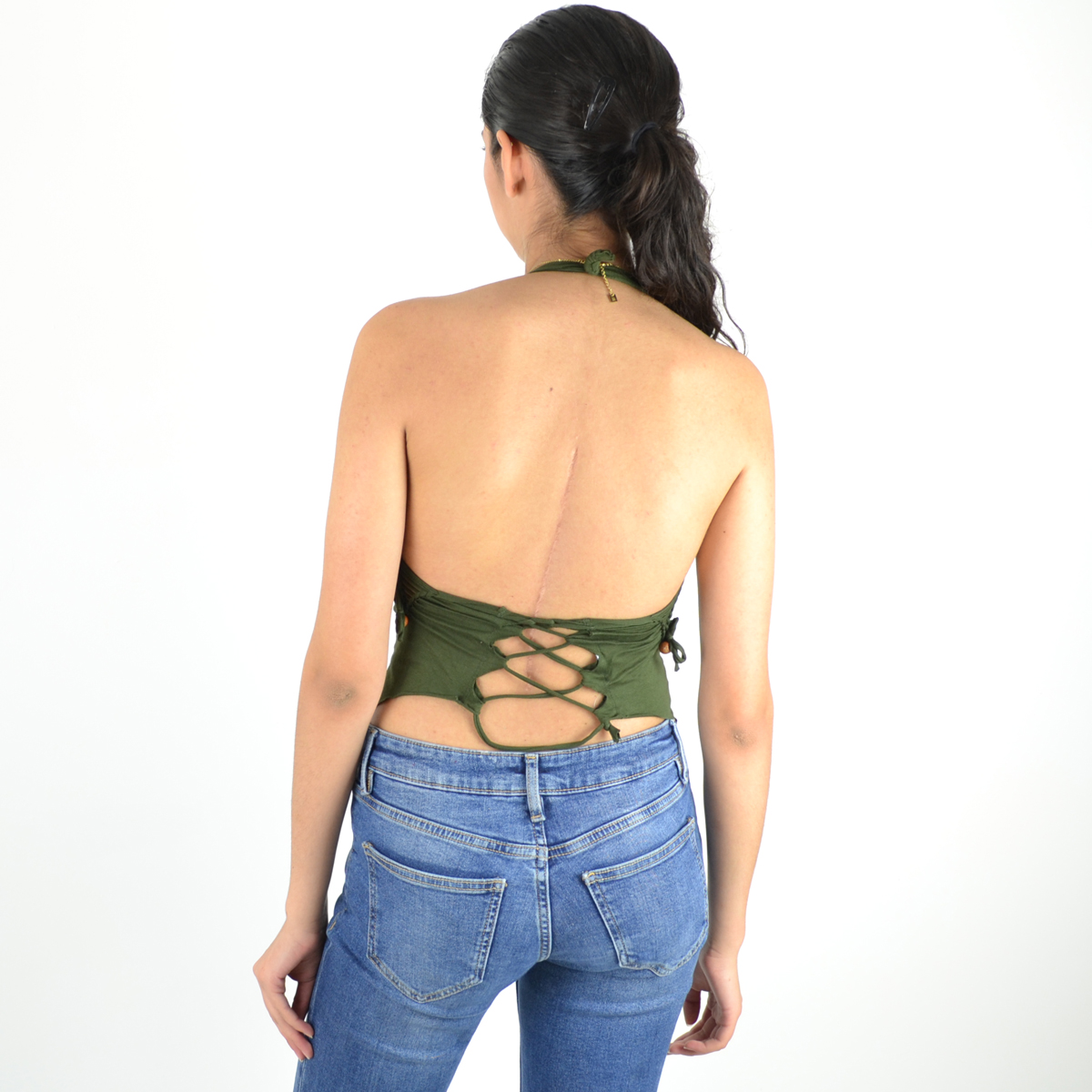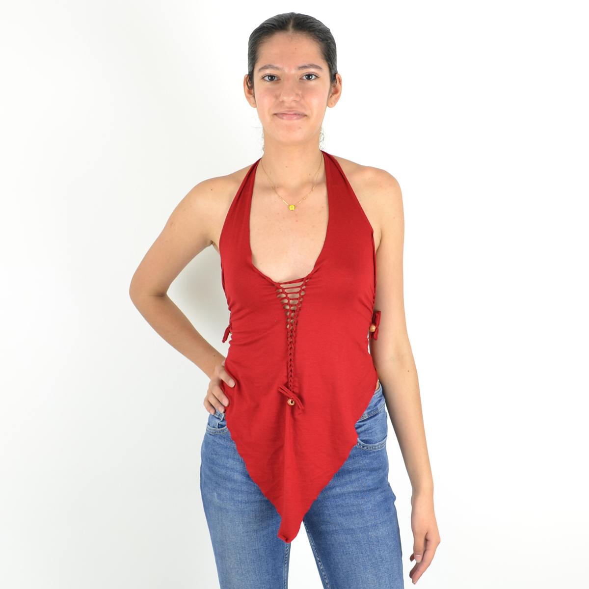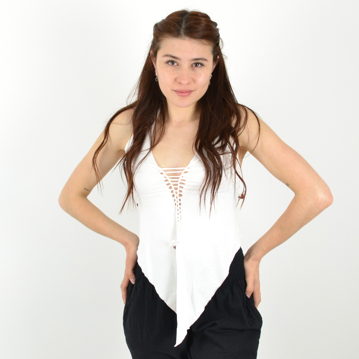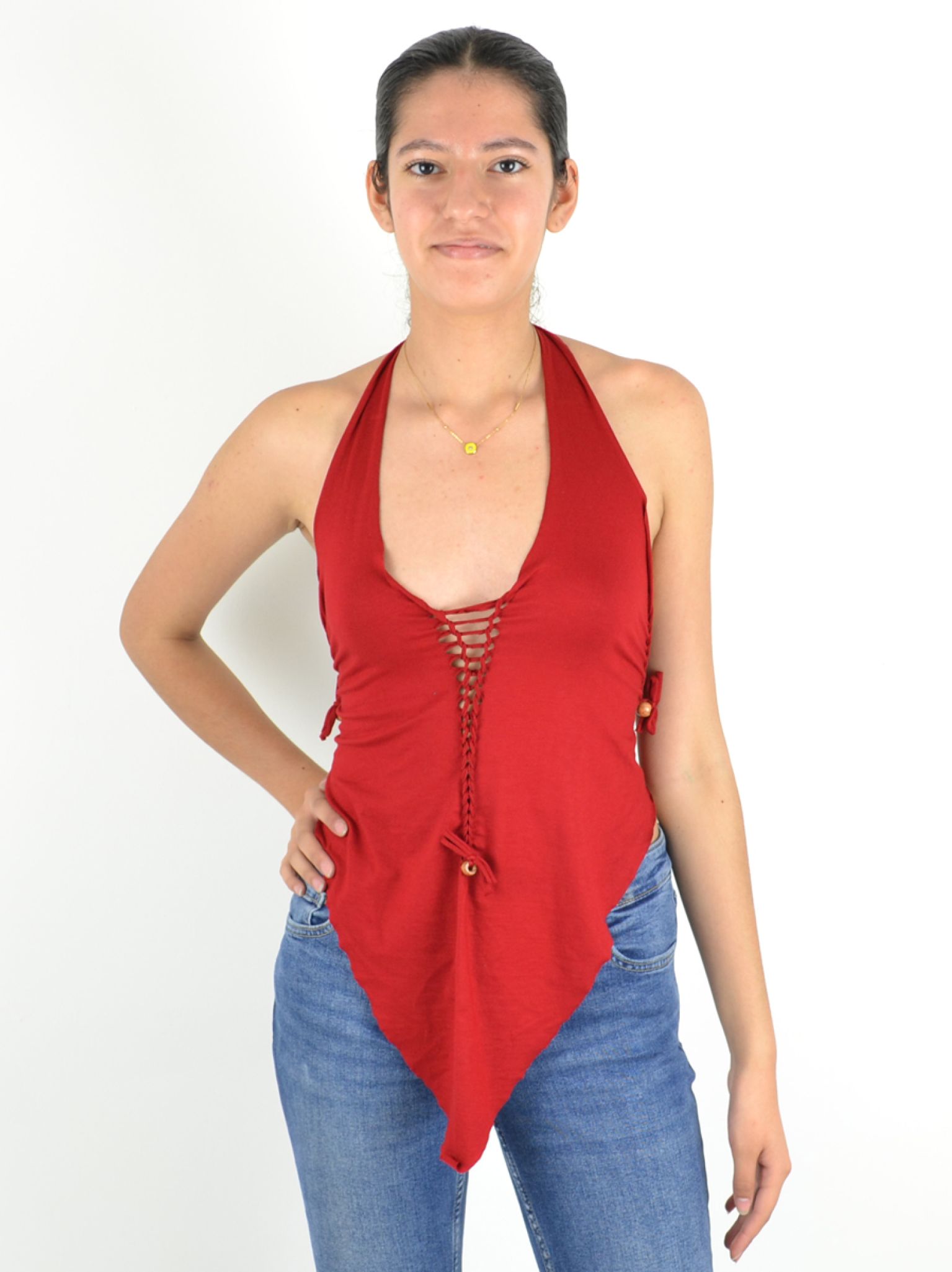 Long devant, court derrière, avec un dos corseté et un laçage ajustable sur le devant, ce top allie féminité et caractère.