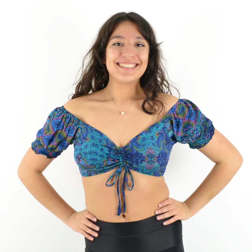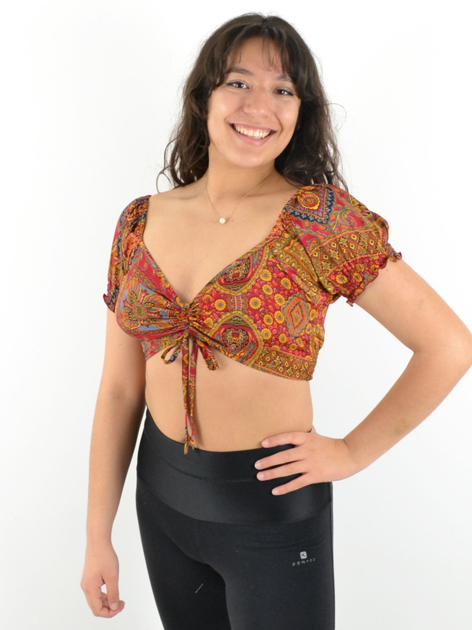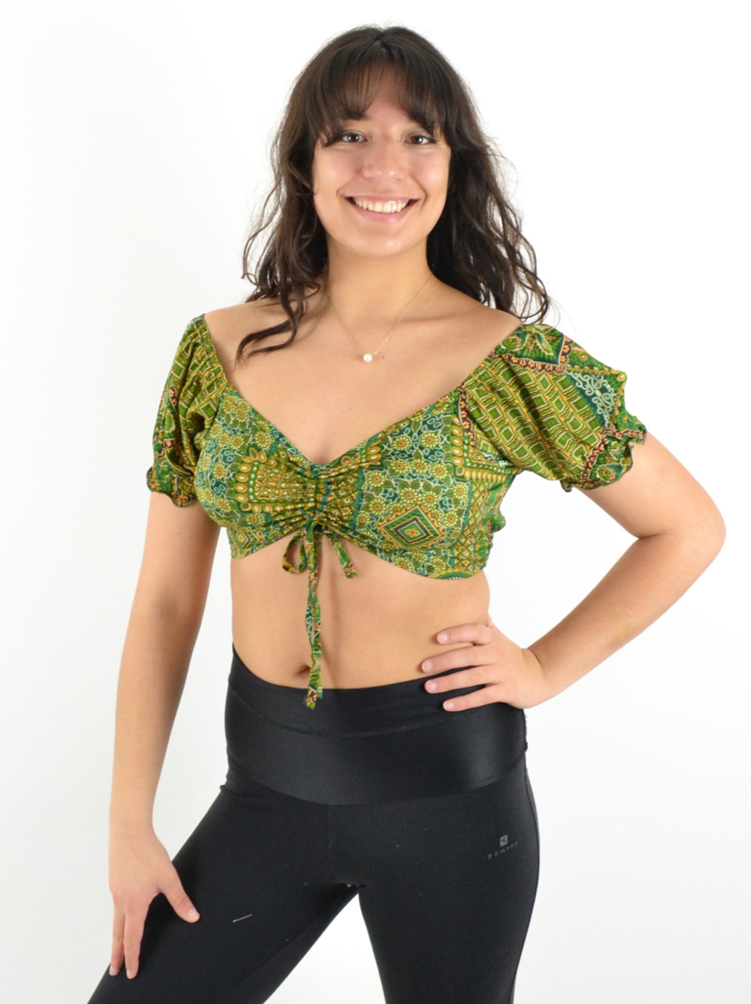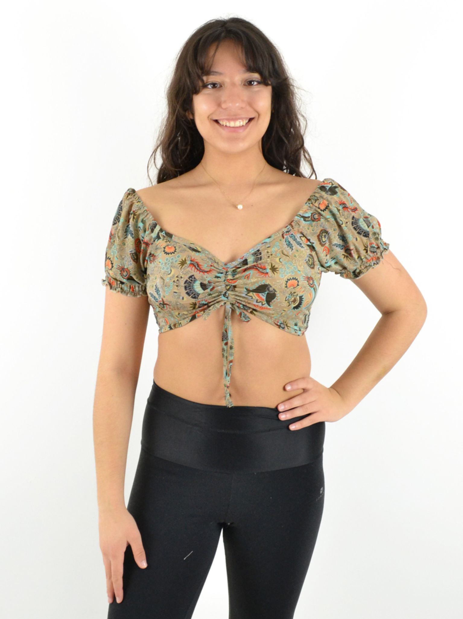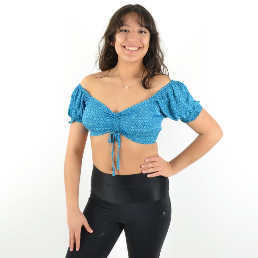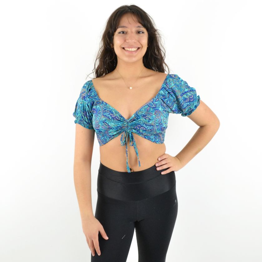 Son col en V et ses deux liens ajustables sur le devant permettent un ajustement parfait, tandis que les manches courtes élastiquées apportent une touche de confort et maintien.