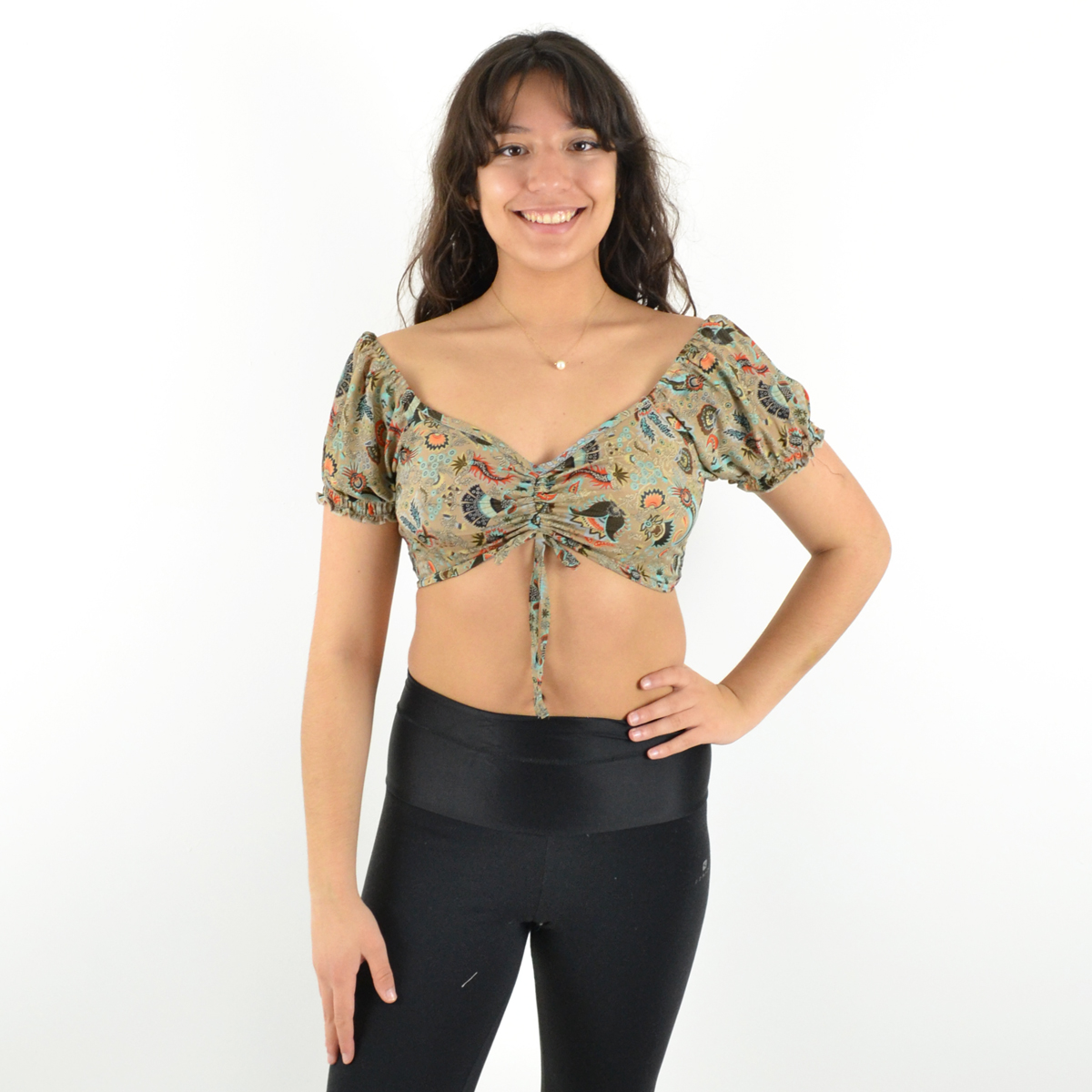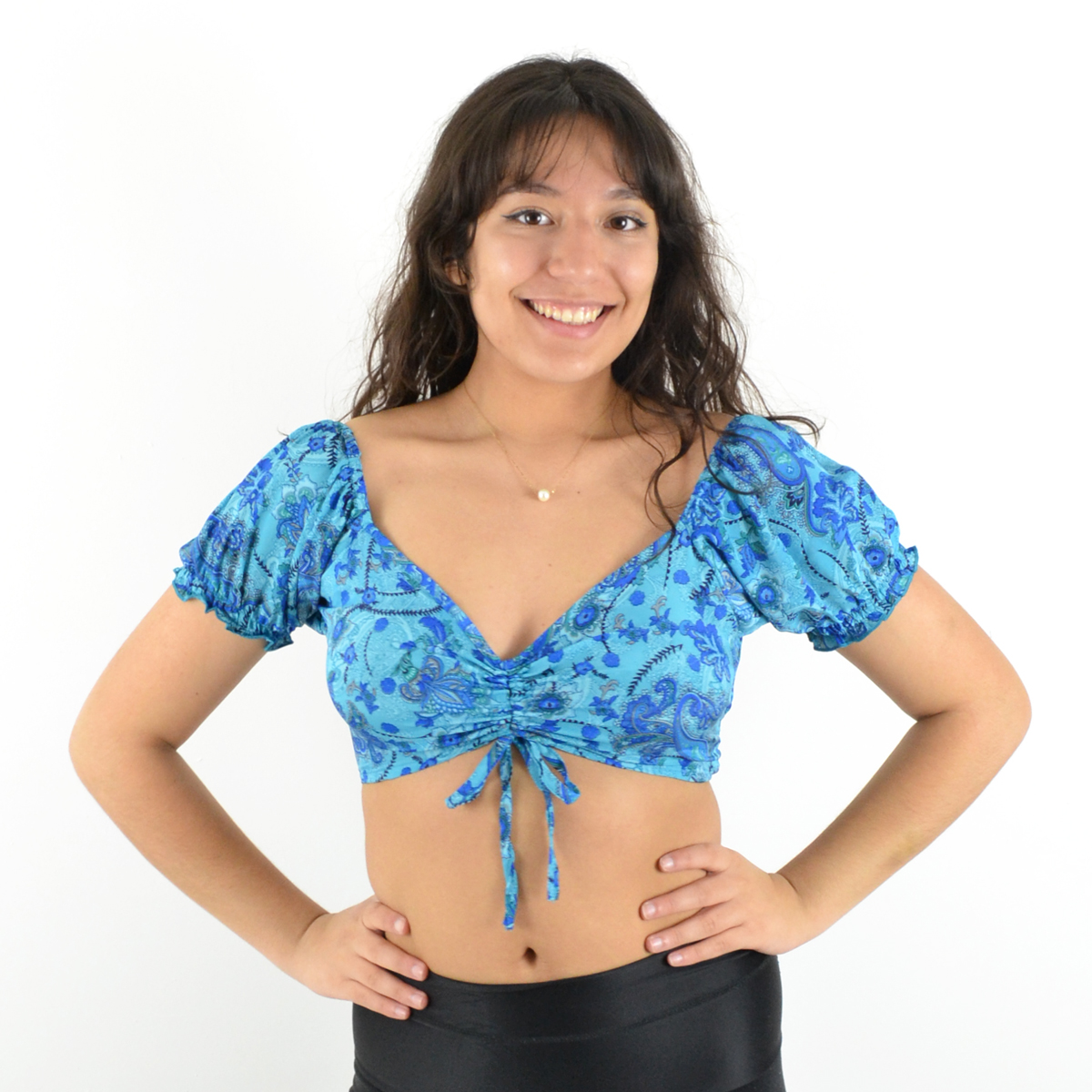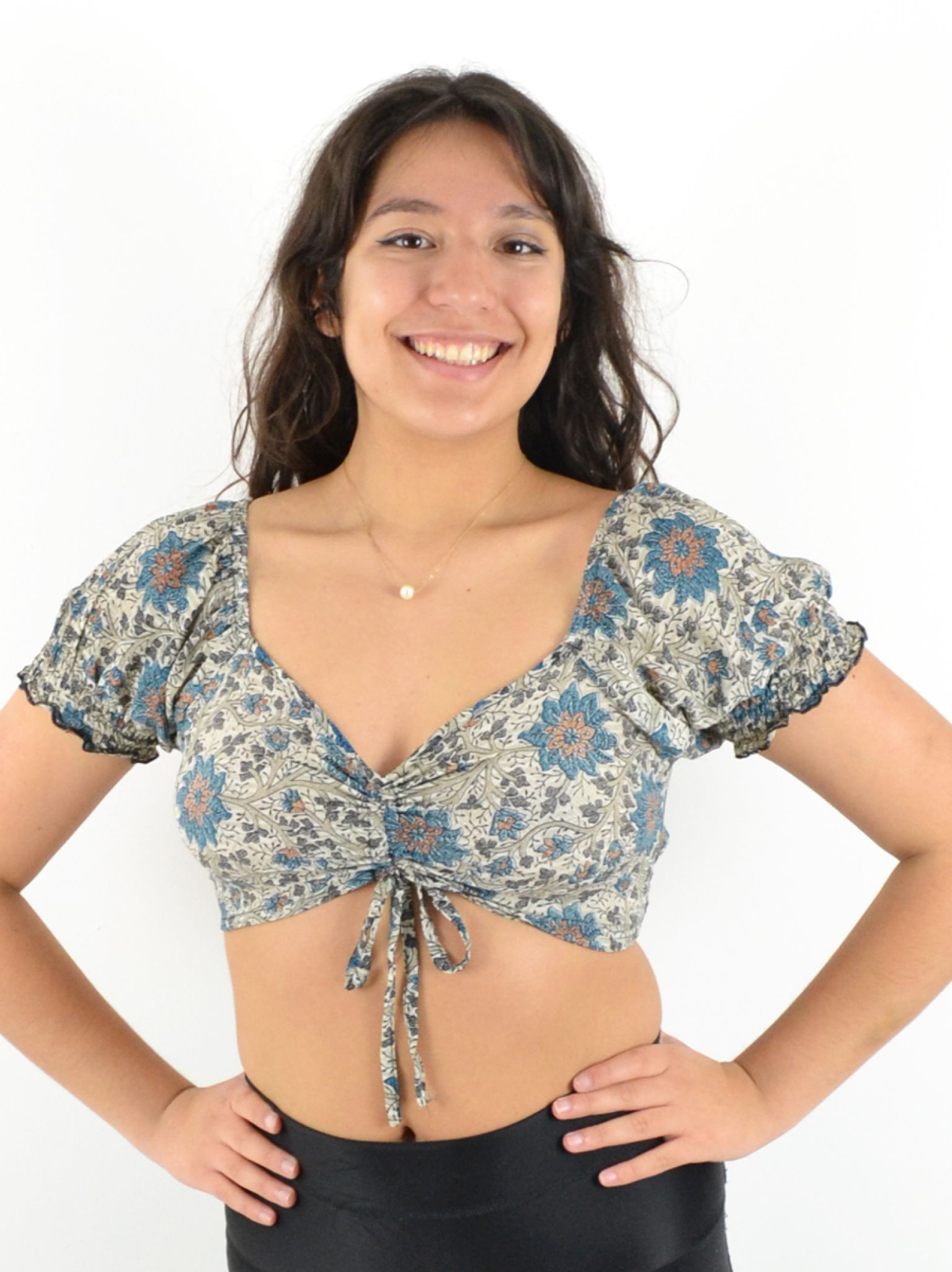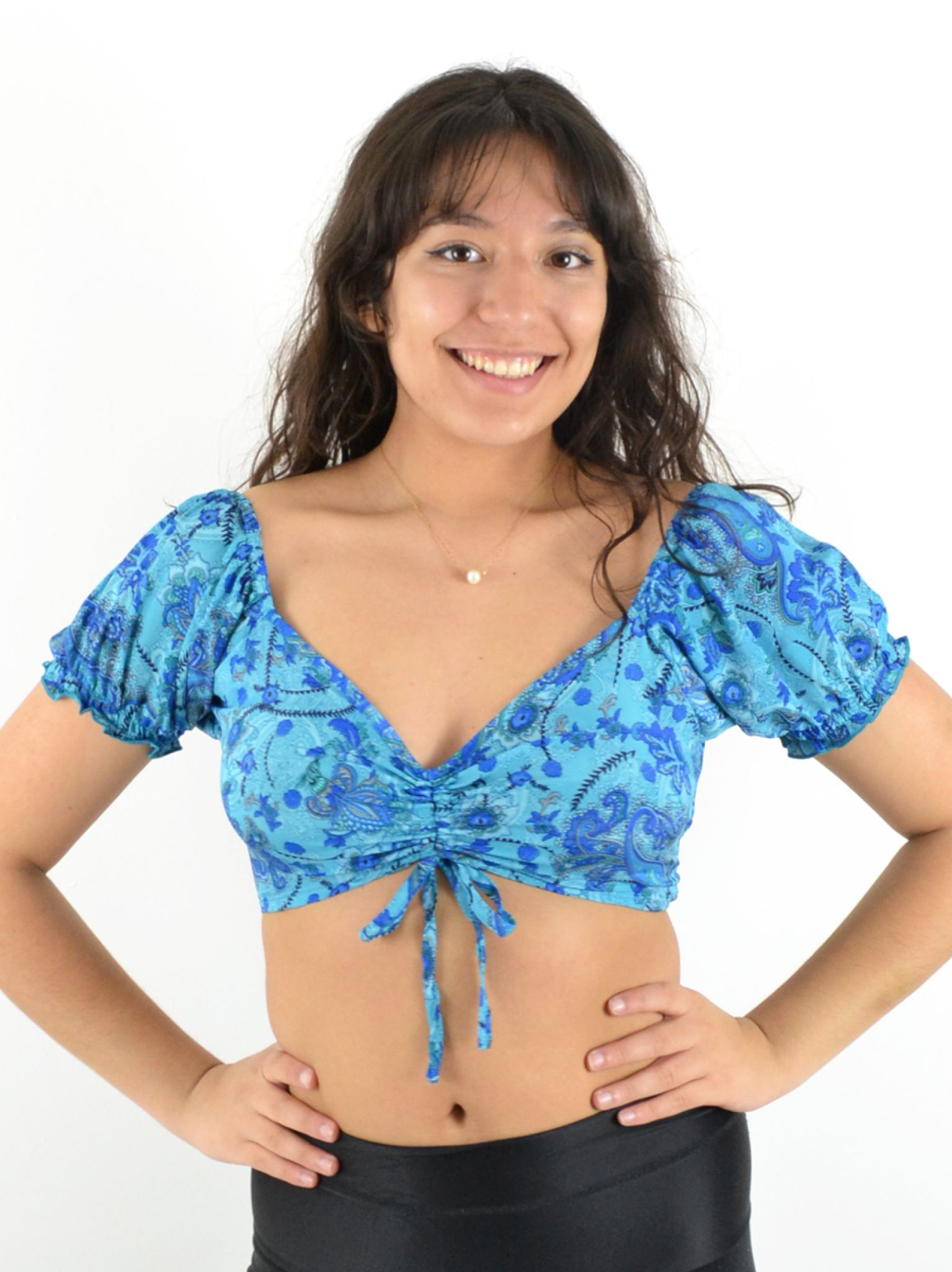 Son col en V et ses deux liens ajustables sur le devant permettent un ajustement parfait, tandis que les manches courtes élastiquées apportent une touche de confort et maintien.