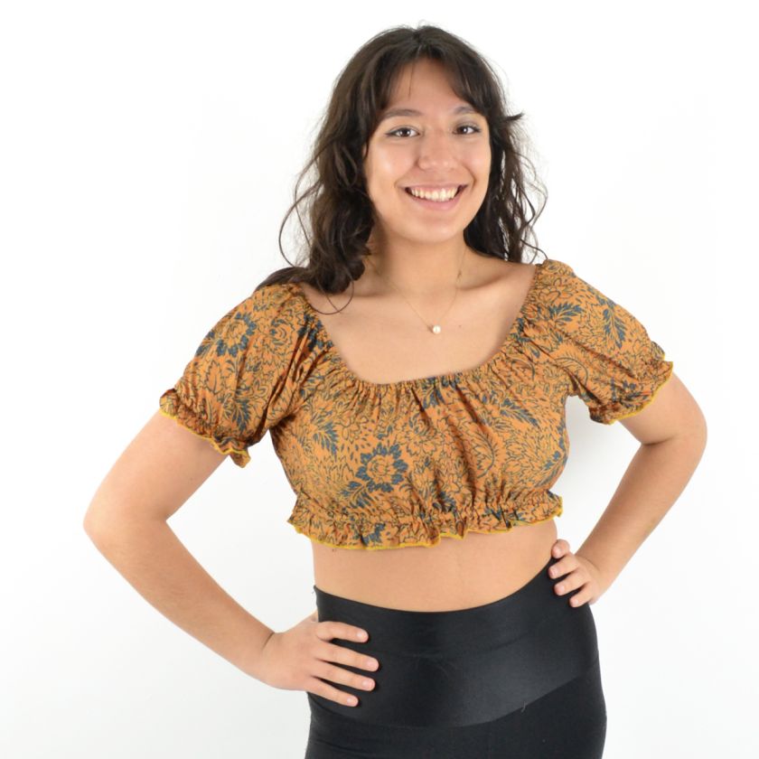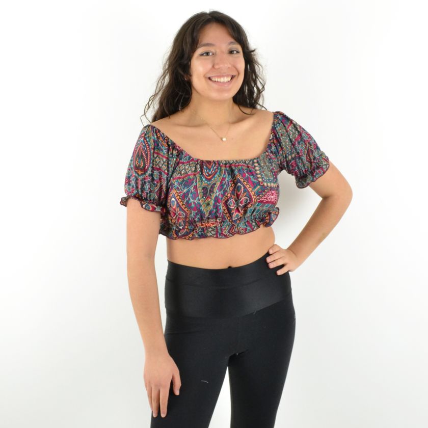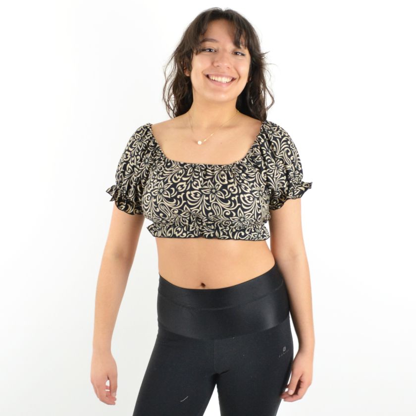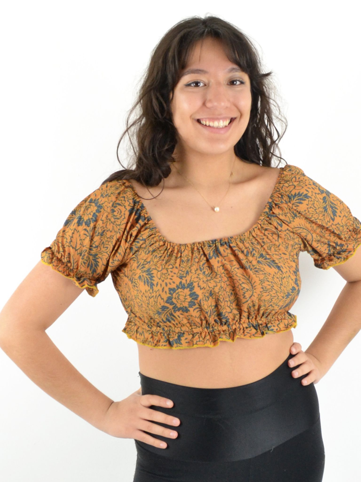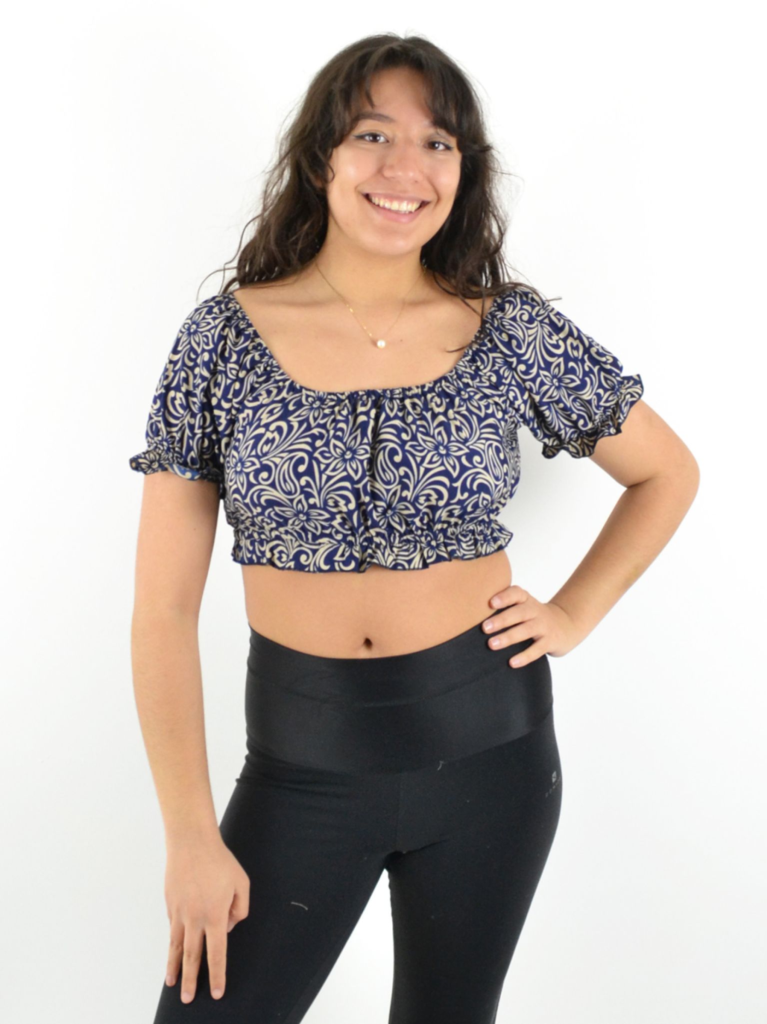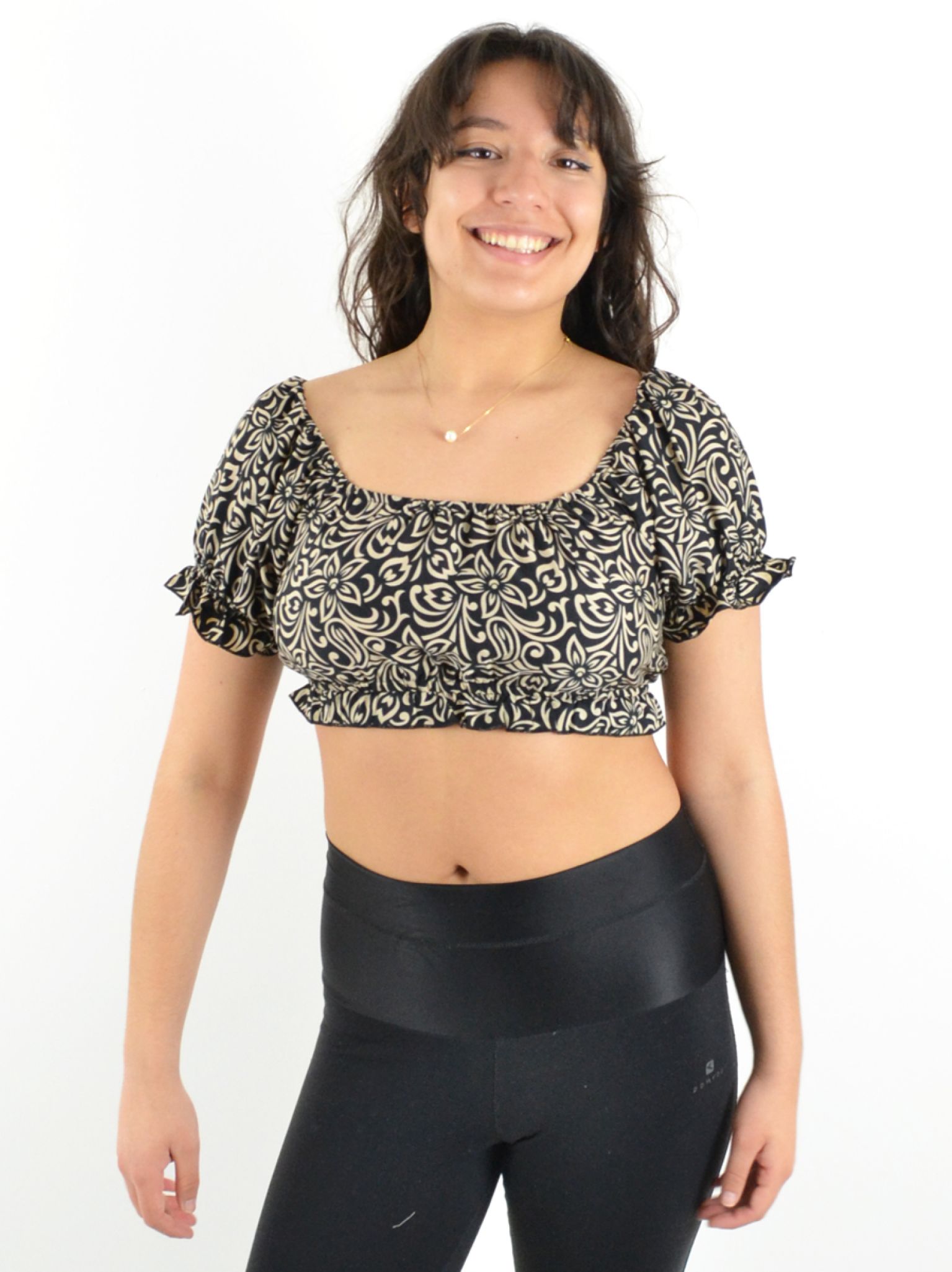 Ce crop top en 100% polyester allie confort et style avec ses manches courtes et sa taille ajustées par un élastique discret.