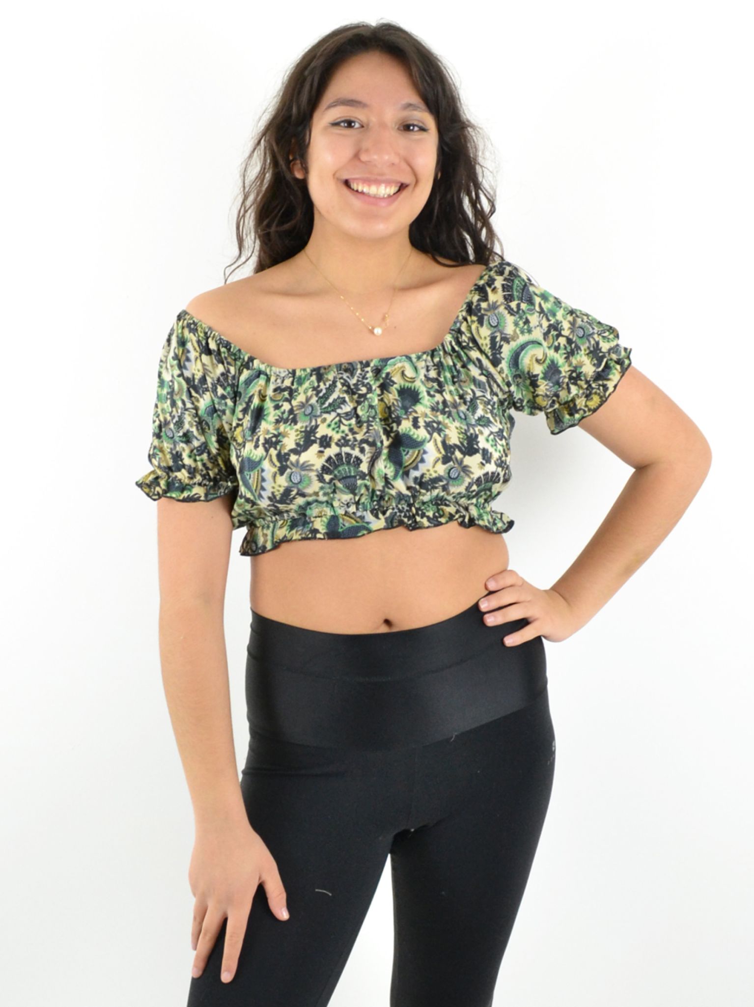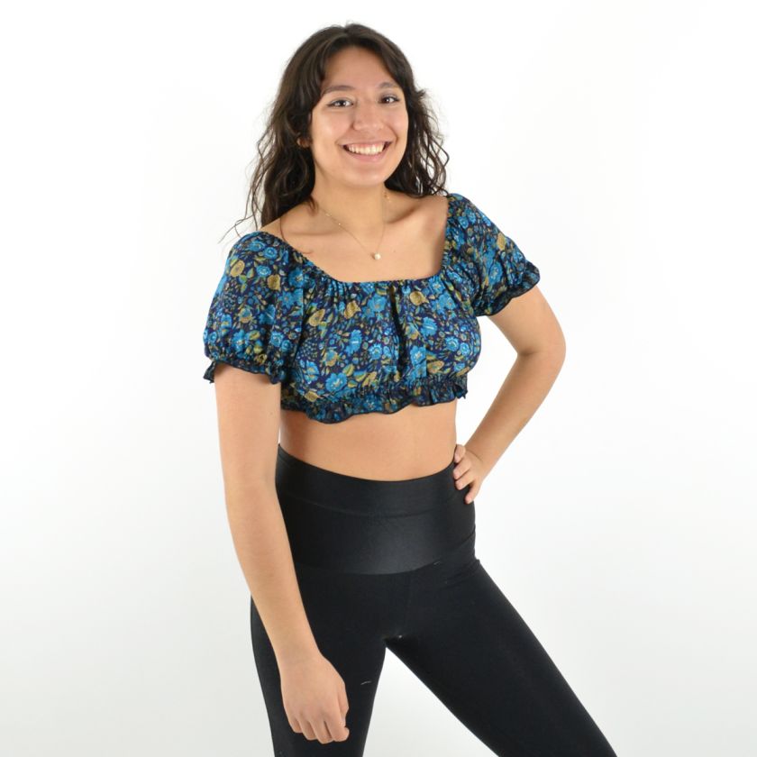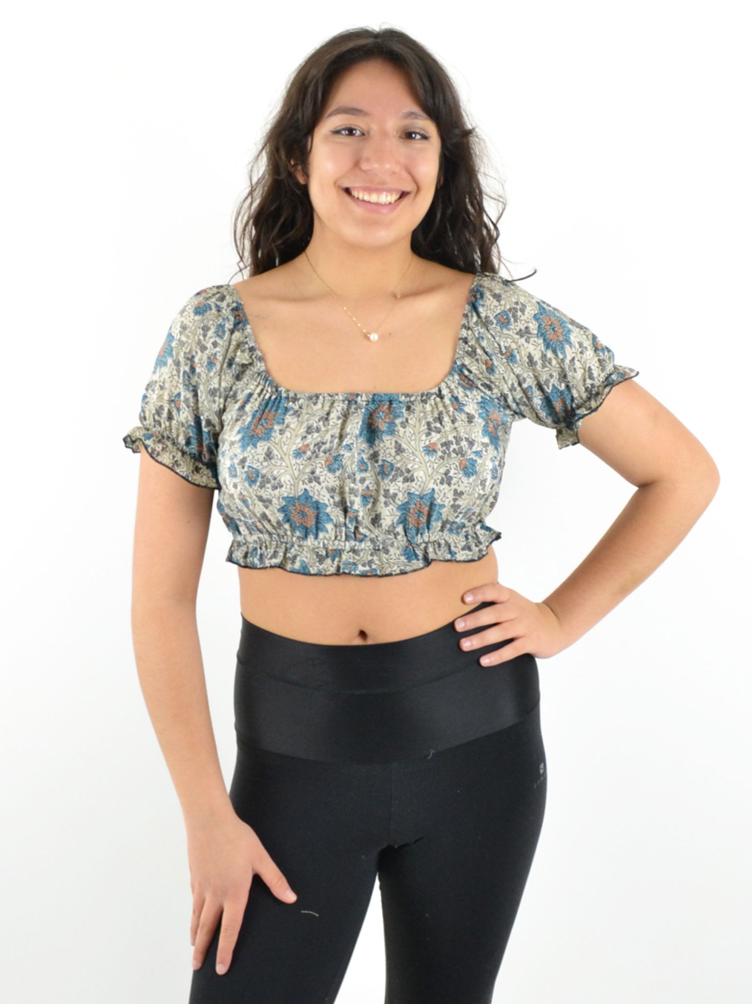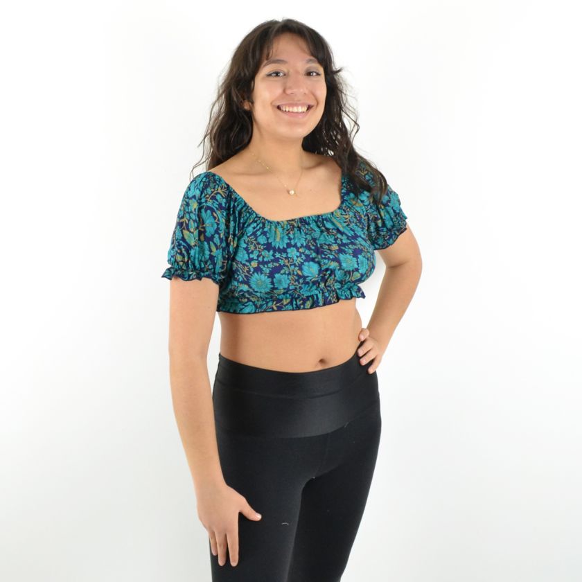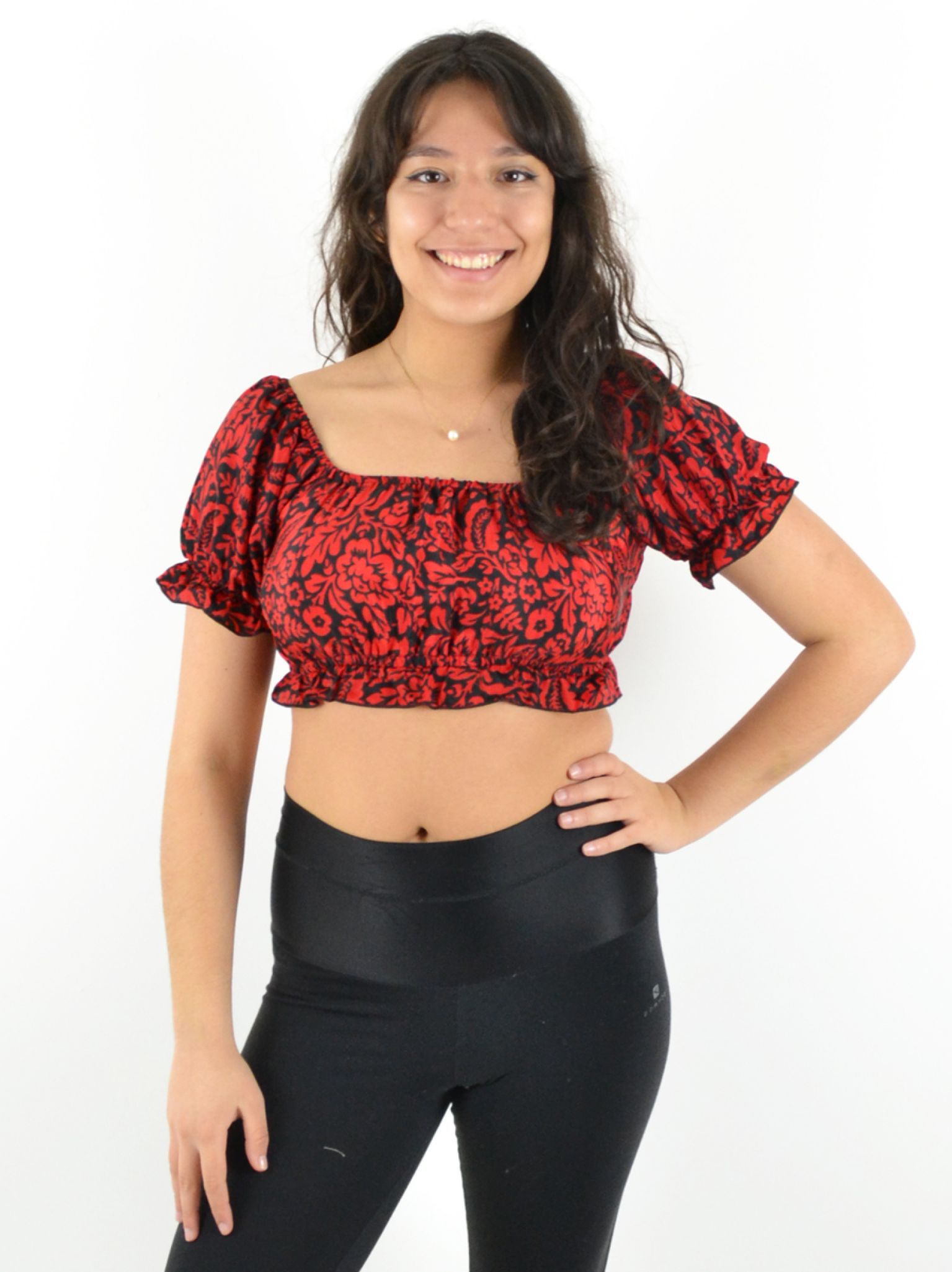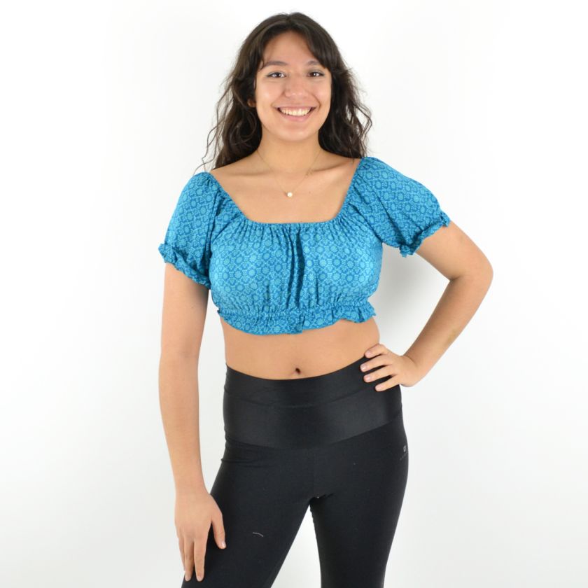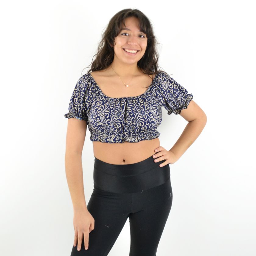 Ce crop top en 100% polyester allie confort et style avec ses manches courtes et sa taille ajustées par un élastique discret.