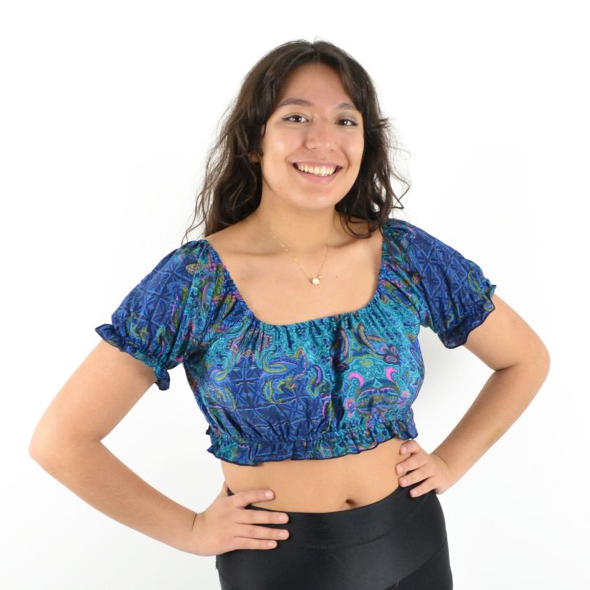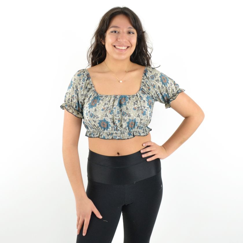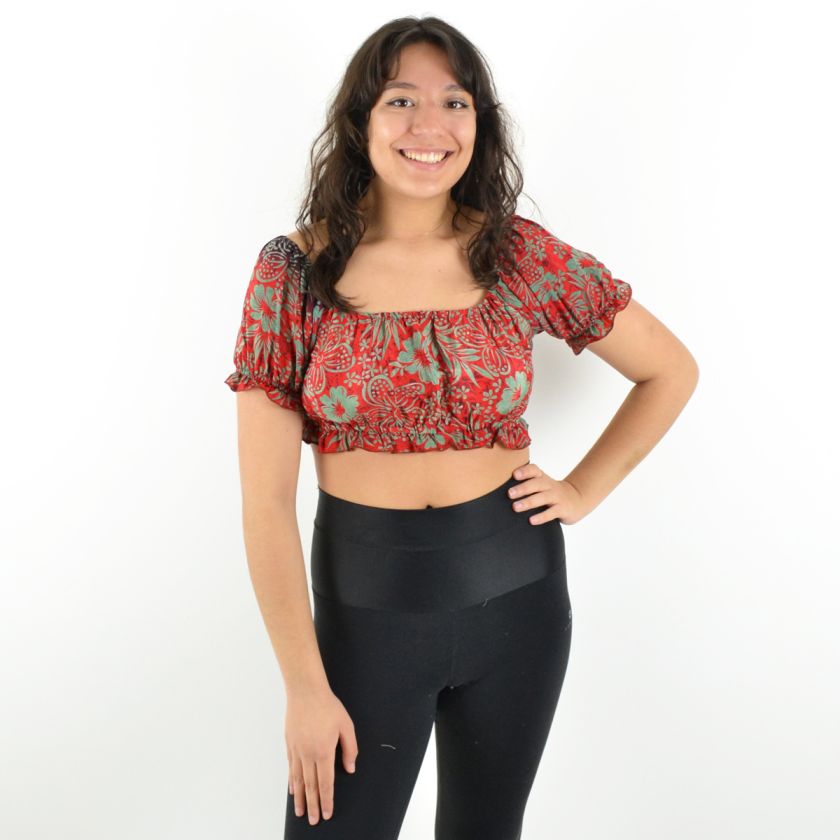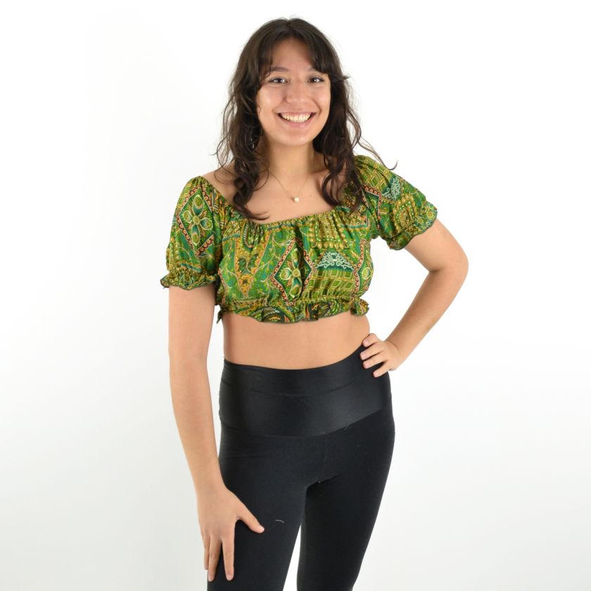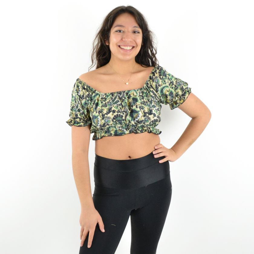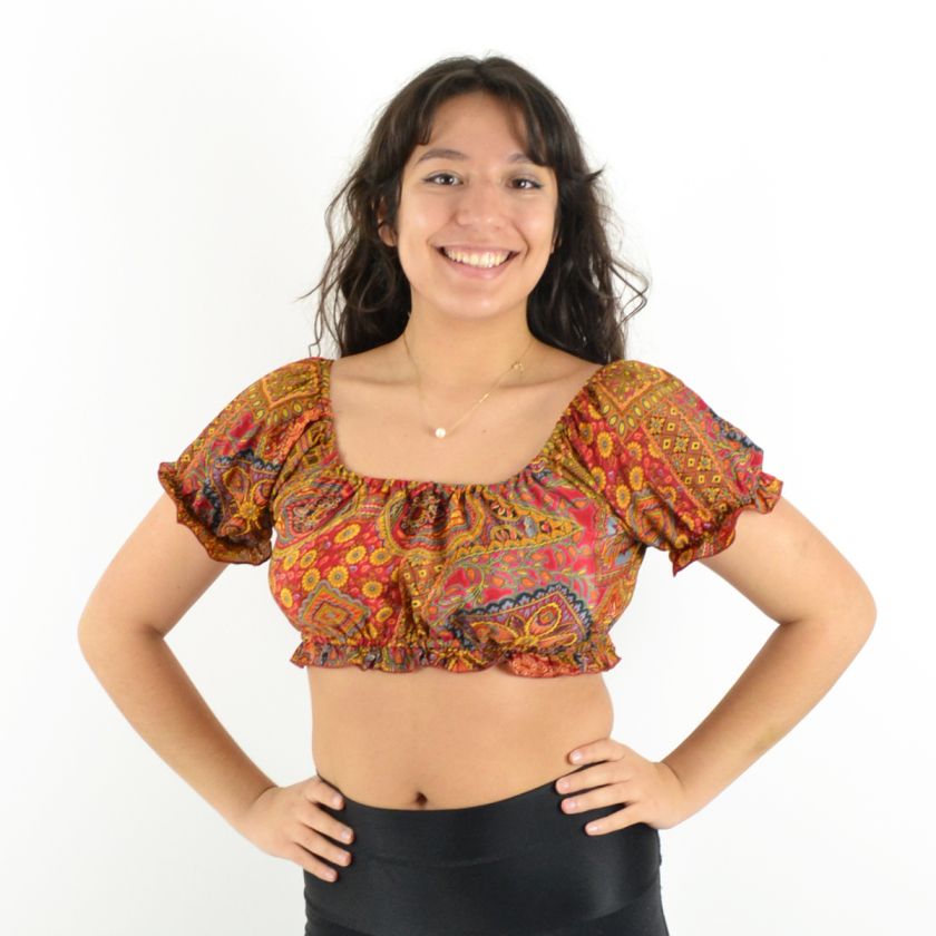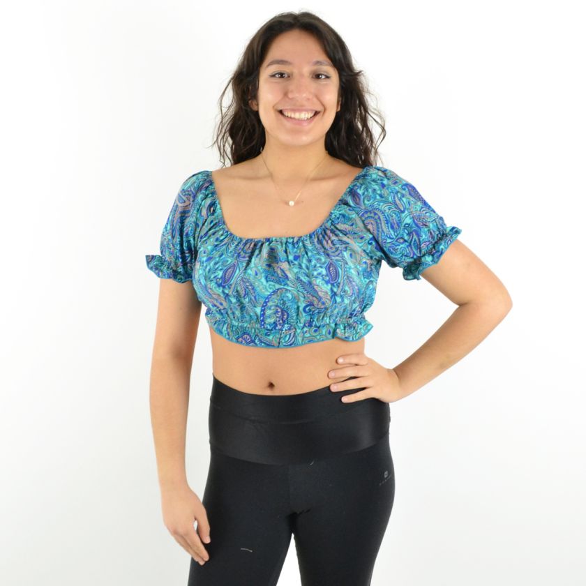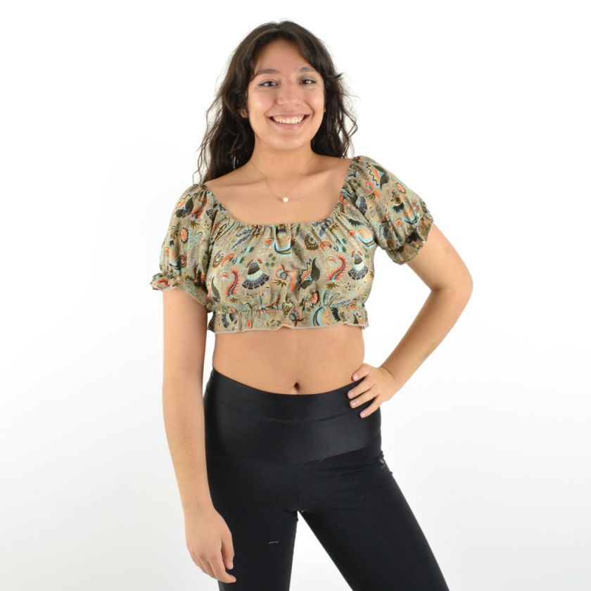 Ce crop top en 100% polyester allie confort et style avec ses manches courtes et sa taille ajustées par un élastique discret.