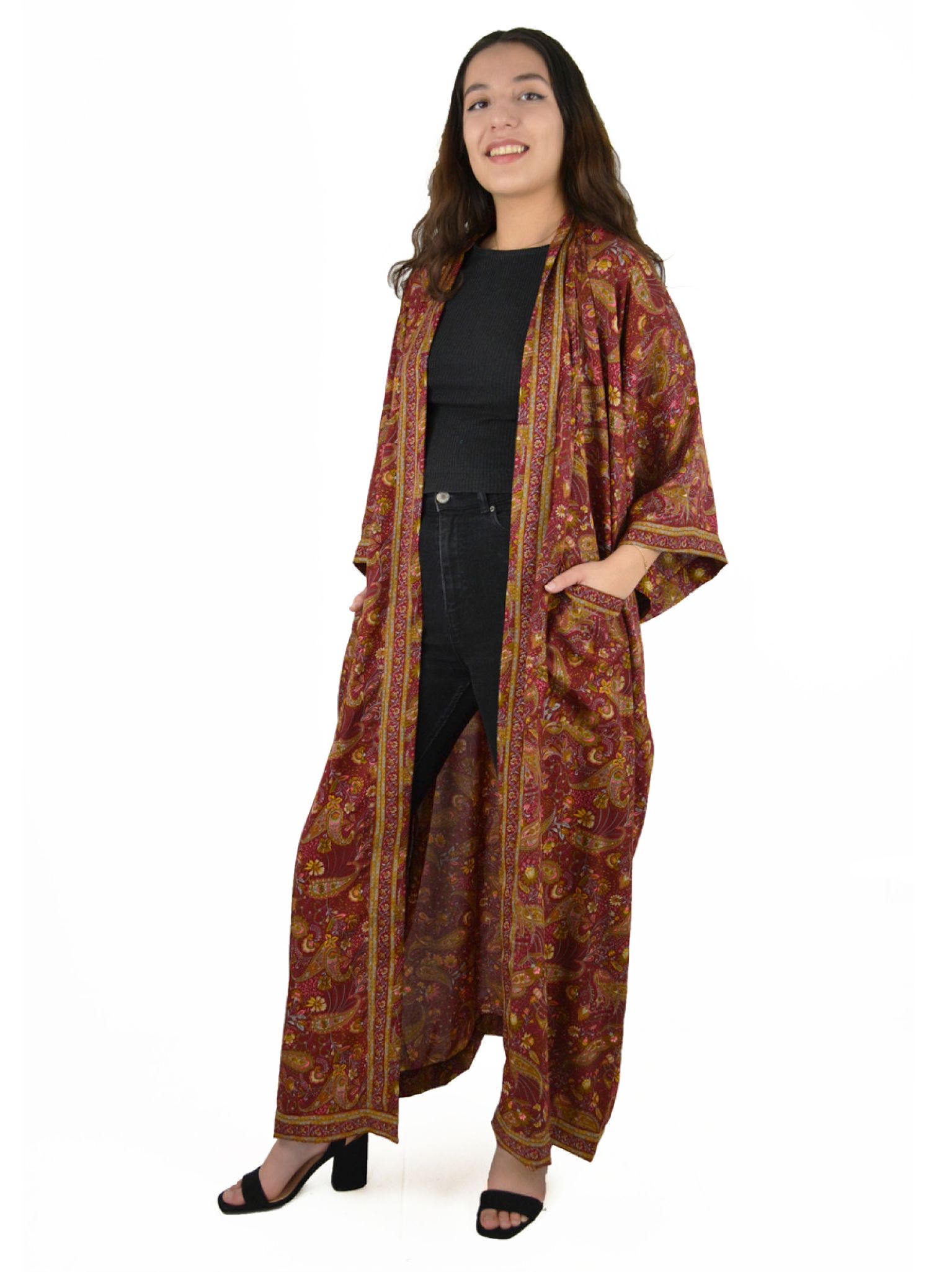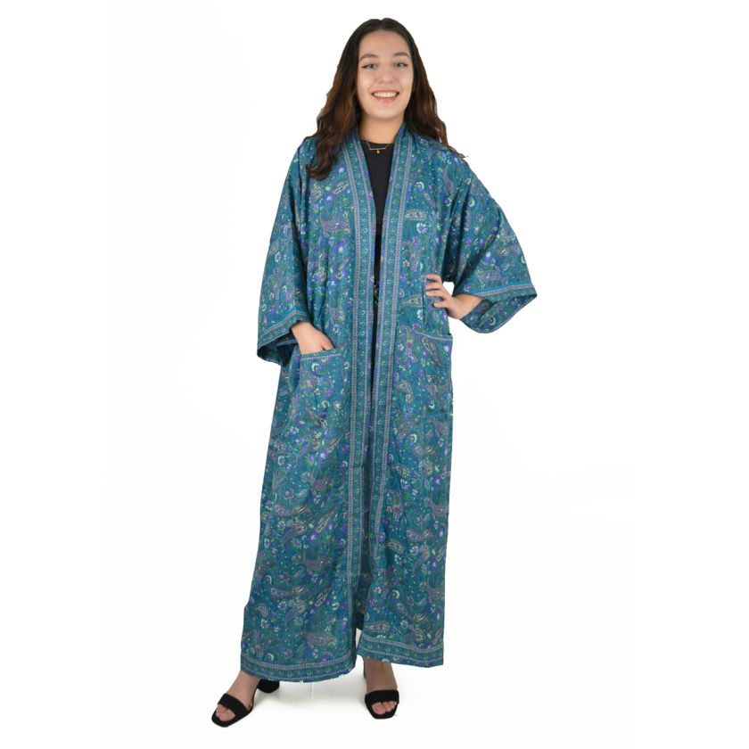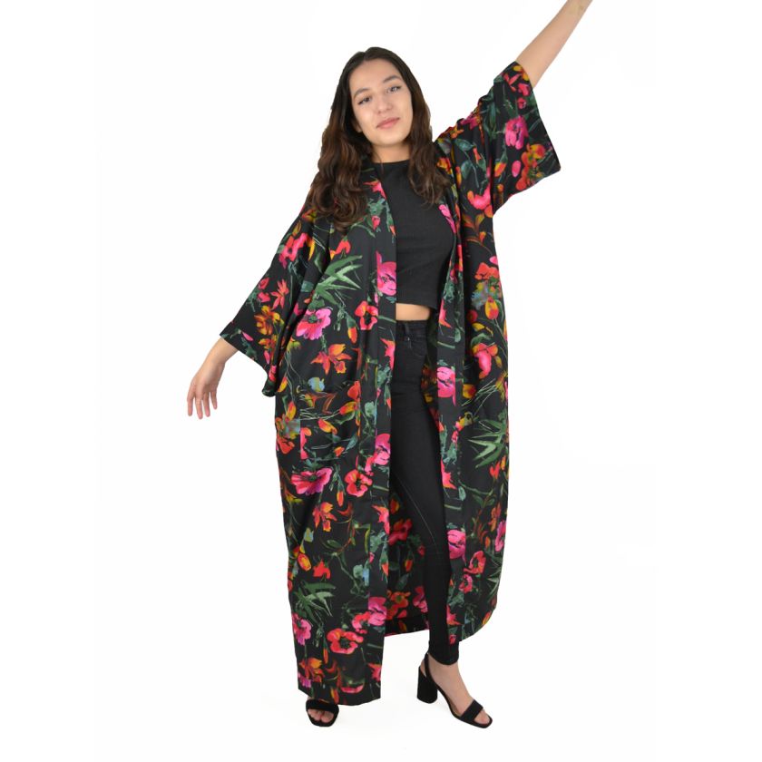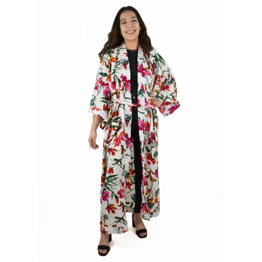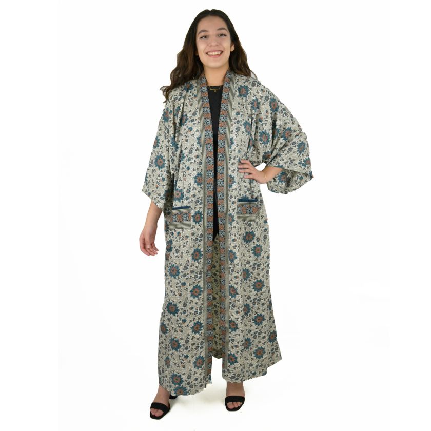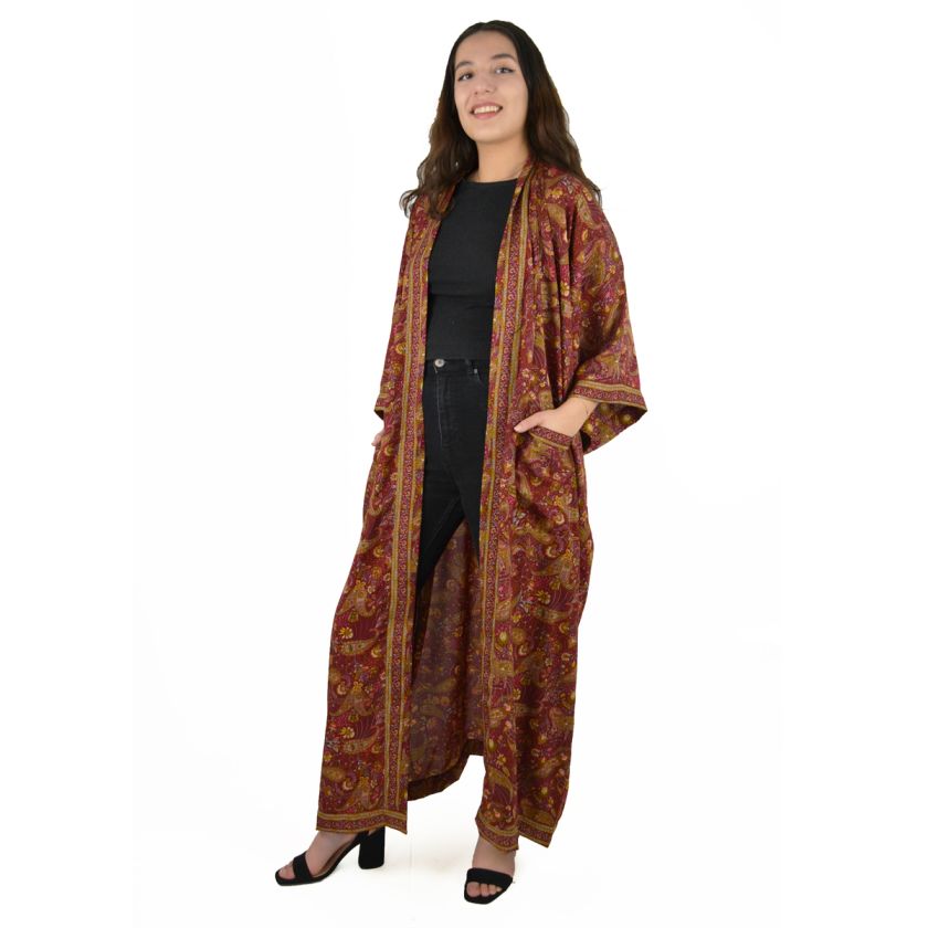 Veste longue style kimono, imprimé fleuri ou indien