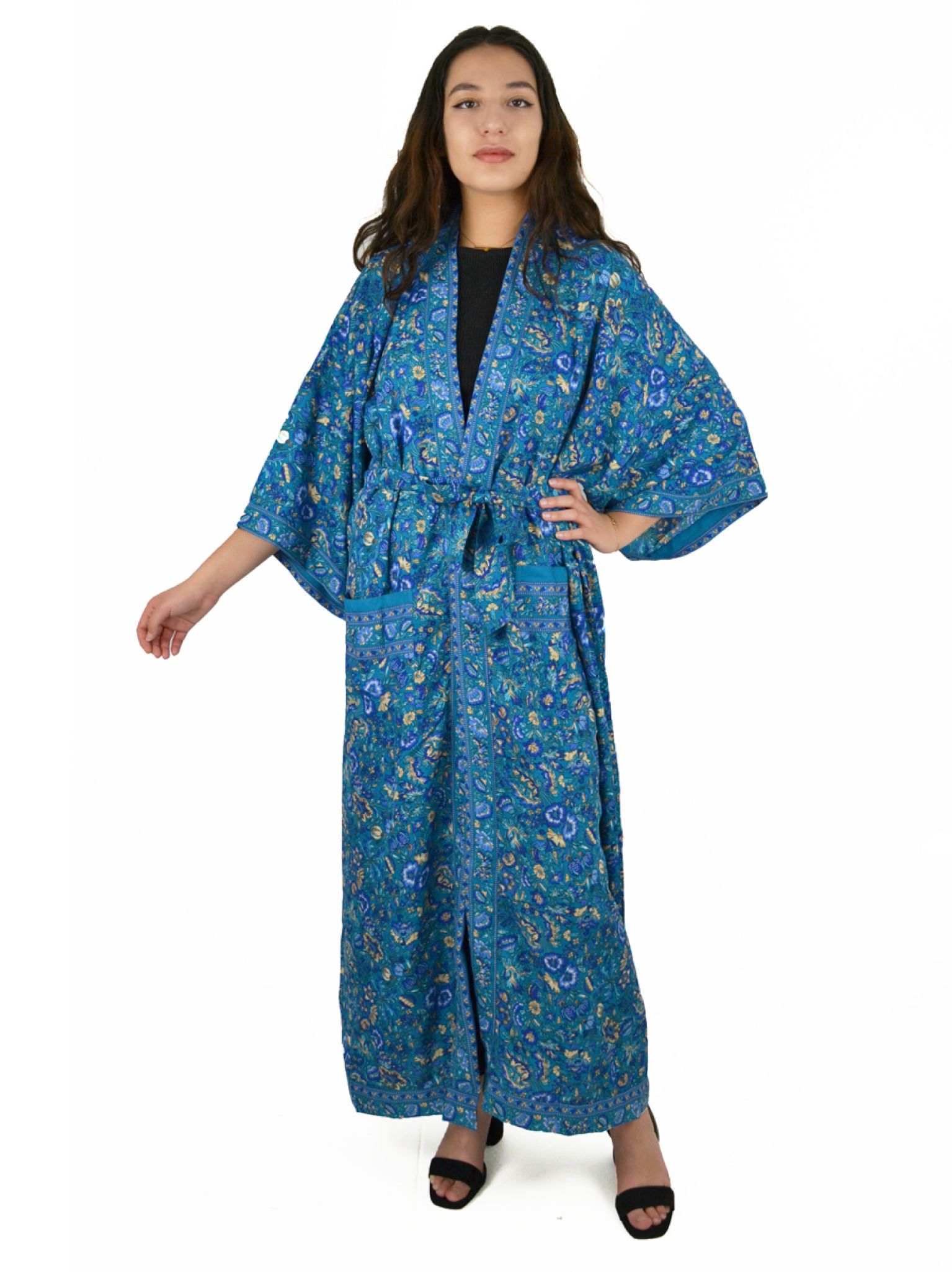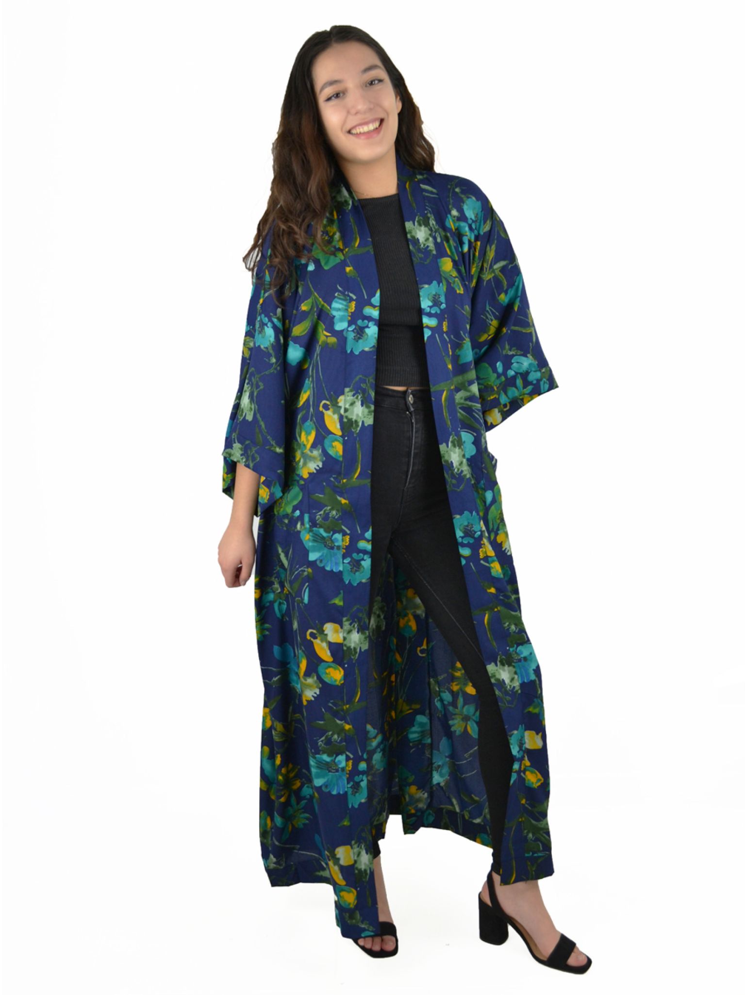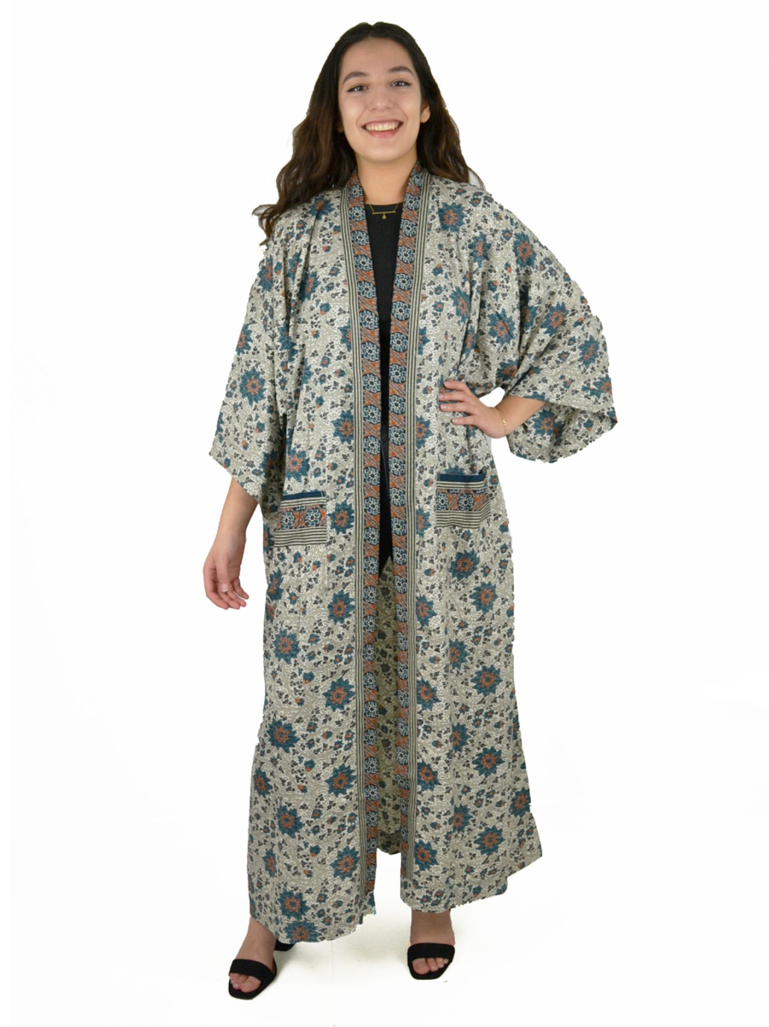 Veste longue style kimono, imprimé fleuri ou indien