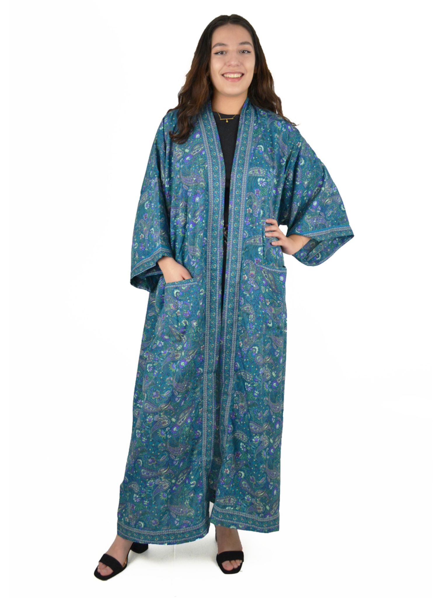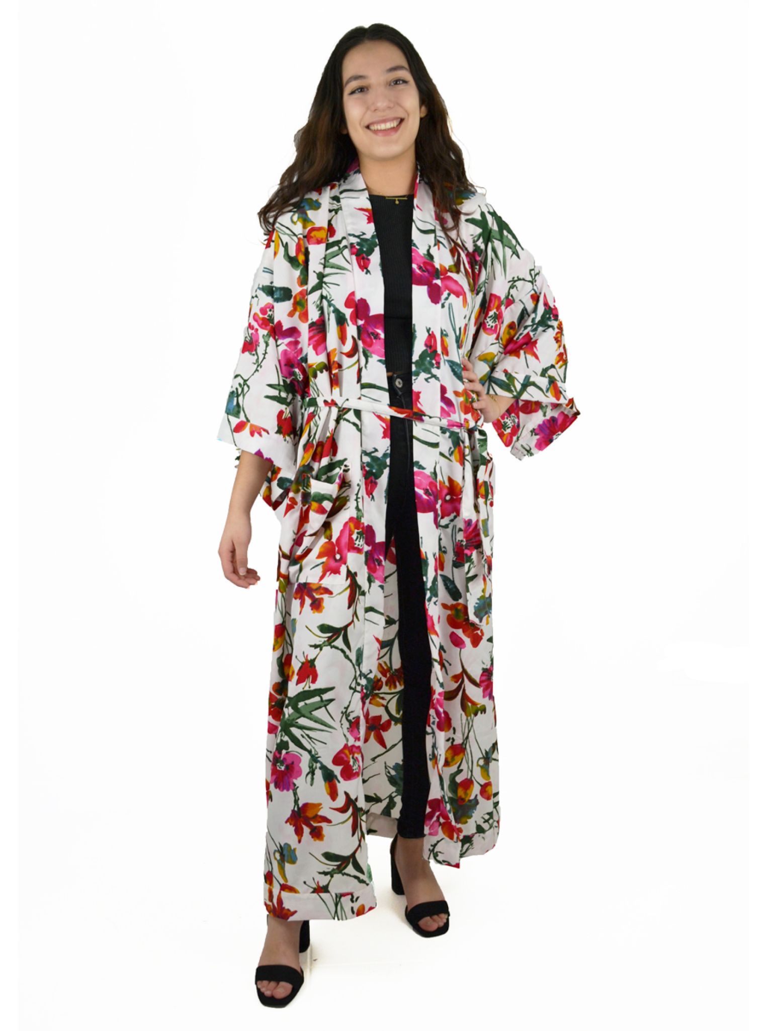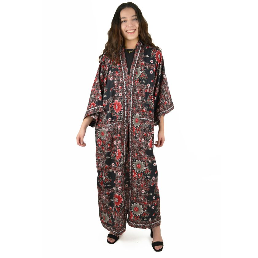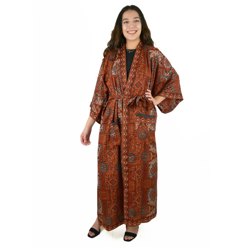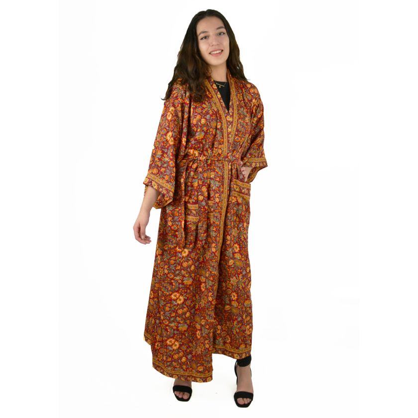 Kimono long 100 % polyester et sa ceinture assortie. Veste très ample, descendant jusqu’aux pieds. Taille unique. Peut se porter ouvert ou fermé.